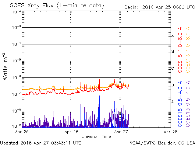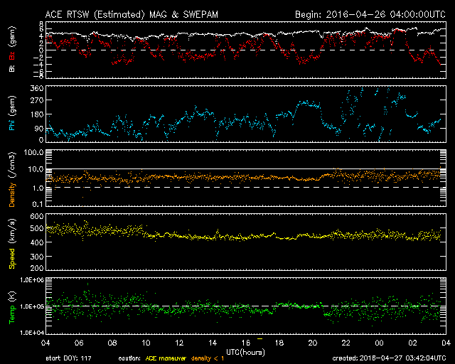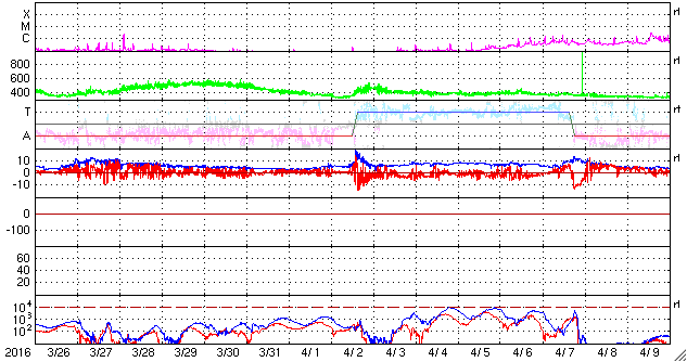 2016/ 4/27 12:43 更新 高速太陽風は終わりつつあります。太陽で小さい活動が増えています。 担当 篠原 昨日480km/秒に下がっていた太陽風の速度は、 深夜には450km/秒に下がり、現在は430km/秒近くになっています。 高速太陽風はほぼ終わったようです。 磁場強度は、5nT付近で安定しています。 南北成分は、北を向いたり、南を向いたりしています。 振れ幅が小さいこともあり、磁気圏への影響は限定的ですが、 AE指数は、300〜600nTくらいの小規模の高まりが、 時々、発生しています。 コロナホールの影響は通り過ぎましたが、 SDO衛星AIA193の写真では、 次のコロナホールが北半球の中央部と、 赤道のやや南側に見えています。 これらは、27日前には見られなかった領域です。 3日後の30日頃から影響がやって来る可能性がありますが、 27日周期の図の前周期の太陽風とは、 違う変化になるかもしれません。 太陽は、昨日新しく見えていた東端(左端)の黒点に、 2536群と番号が付きました。 Bクラスの小さいフレアですが、頻繁に起きているようで、 X線のグラフは、少しにぎやかになっています。 また、西側(右側)に2537群、 東側(左側)にもうひとつ新しい黒点が現れています。