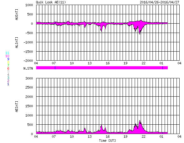 (c) SDO (NASA) ![]() SDO衛星による太陽の可視光写真。マウスの矢印を写真に重ねると、黒点番号付きの写真に切り替わります。 (c) SDO (NASA) ![]() ACEが観測した太陽風の磁場(1番上の枠、白線は全体の強度、赤線は南北成分) および、太陽風の密度(3番目の橙線)、速度(4番目の黄線) (c) NOAA/SWPC ![]() リアルタイムAE指数 下段のAEグラフの値が高くなると、オーロラ活動が活発化しています。 (c) 京都大学, NICT ![]() 27日の太陽周期に合わせたデータプロット 太陽が同じ面を地球に向けていた27日前の変化から、今後を予想することができます。 (c) 作図:宇宙天気ニュース