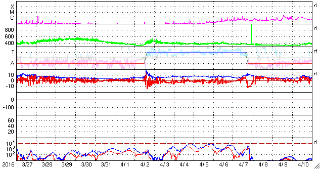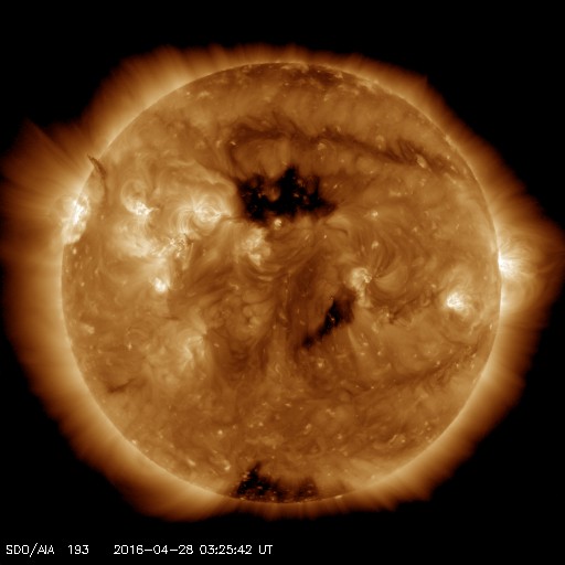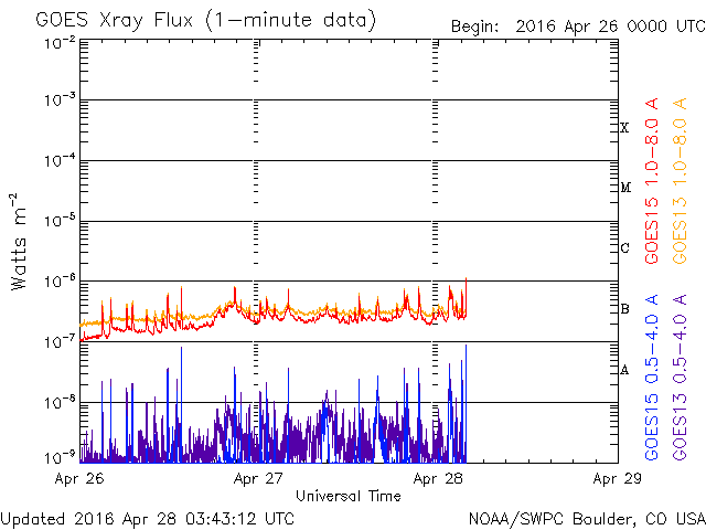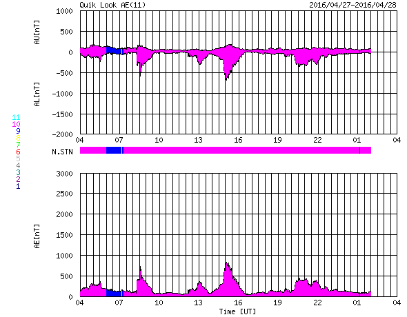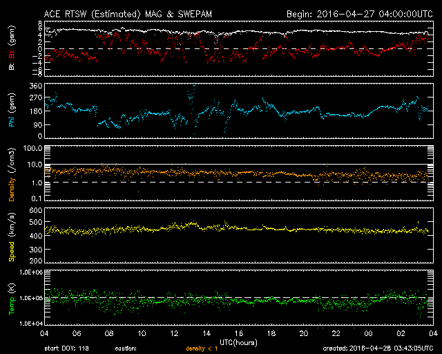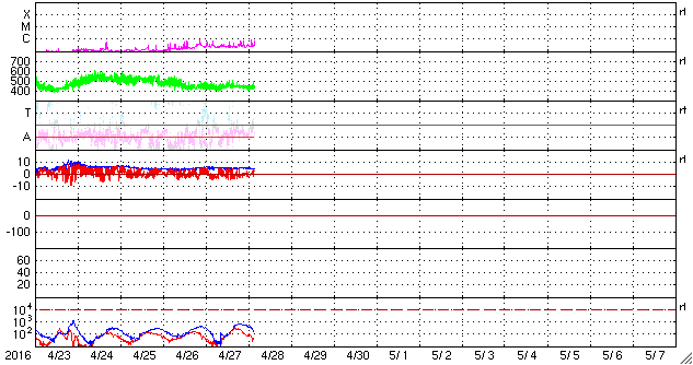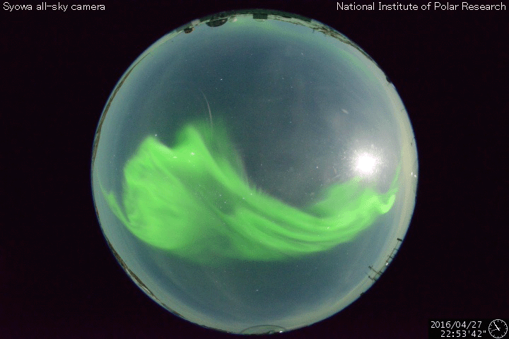 2016/ 4/28 12:43 更新 太陽風はやや高速で、磁気圏の活動も少し活発になっています。 担当 篠原 太陽風の速度は、440km/秒前後の状態が続いています。 高速風の状態から下がってきましたが、 まだ、完全には下がっていない印象です。 磁場強度は、5nTと平均的な状態です。 南北成分は、比較的短い時間で南北に変化しています。 磁気圏の活動は、昨日よりも少し高まっていて、 AE指数は、400〜800nTの中規模の変化が、 数時間おきに発生しています。 グラフの中の、最後の高まりにあたる、 世界時27日23時頃の昭和基地のオーロラを紹介します。 特に活発な変化ということでもありませんが、 久しぶりに昭和基地のオーロラを掲載しています。 SDO衛星AIA193の太陽写真では、 北半球のコロナホールが、 中央部にやや大きく広がっています。 現在、ここから地球の方向に 高速の太陽風が吹き出している可能性があります。 30日以降の太陽風の変化に注目して下さい。 太陽では、西の2537群の黒点が増えています。 2535群の活動がやや強まり、 X線のグラフは小さい変化が目立っています。 もう一段規模が大きくなると、 変化がCクラスに達するようになるでしょう。 と書いたところで、 最後に、Cに届くフレアが起きたようです。 ![]() 南極の昭和基地で、世界時27日23時頃に撮影されたオーロラ。 (c) 国立極地研究所、(動画加工 : 宇宙天気ニュース) ![]() SDO衛星のAIA193カメラによる太陽コロナの様子 (c) SDO (NASA) ![]() SDO衛星による太陽の可視光写真。マウスの矢印を写真に重ねると、黒点番号付きの写真に切り替わります。 (c) SDO (NASA) ![]() ACEが観測した太陽風の磁場(1番上の枠、白線は全体の強度、赤線は南北成分) および、太陽風の密度(3番目の橙線)、速度(4番目の黄線) (c) NOAA/SWPC ![]() リアルタイムAE指数 下段のAEグラフの値が高くなると、オーロラ活動が活発化しています。 (c) 京都大学, NICT ![]() 27日の太陽周期に合わせたデータプロット 太陽が同じ面を地球に向けていた27日前の変化から、今後を予想することができます。 (c) 作図:宇宙天気ニュース
