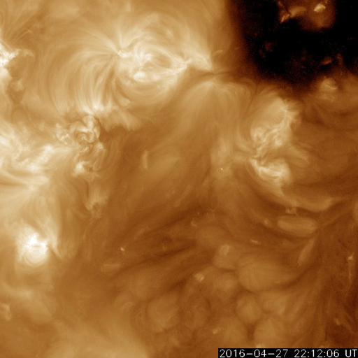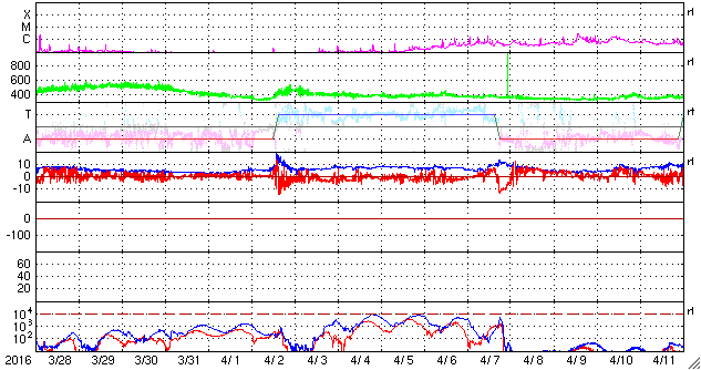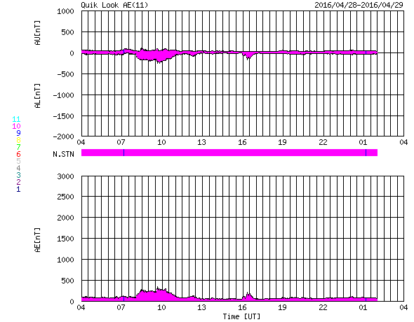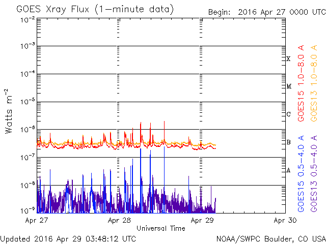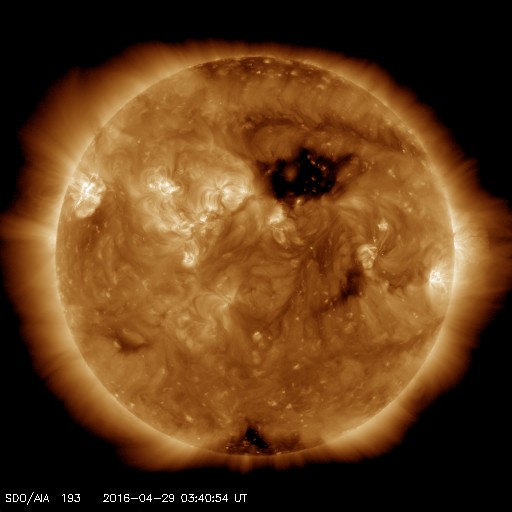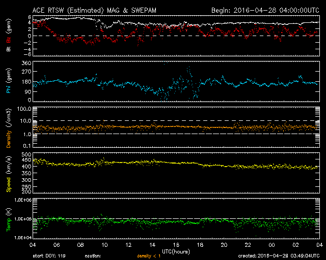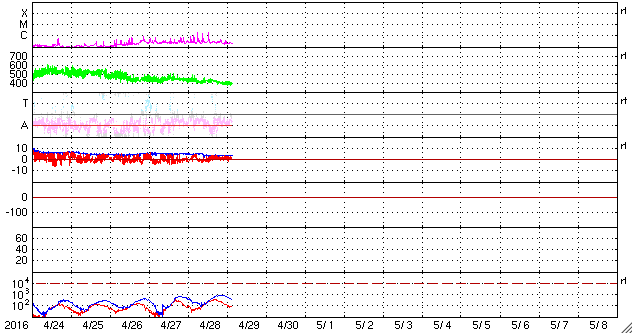 2016/ 4/29 12:49 更新 太陽風は平均的な状態ですが、コロナホールの影響が近づいています。 担当 篠原 2535黒点群の活動度が少し高まり、 C1.1、C1.8、C1.7、C1.9と、小さいものばかりですが、 Cクラスのフレアを連続的に起こしています。 SDO衛星AIA193の動画を掲載します。 Cクラスに達していない小さいものも含めて、 活発に爆発が発生しています。 X線グラフの様子では、 既に落ち着きつつあるようにも見えますが、 引き続き注目してください。 太陽風は、450km/秒から400km/秒へ 速度が少し下がっています。 磁場強度は、4nT前後で安定しています。 コロナホールの影響が近づいていると思いますが、 このまま太陽風が高まり始めるのか、 一旦、低速の風に変わるのか、 到来のタイミング次第ですが、どうなるでしょうか。 磁場の南北成分は、 ACEのグラフの中盤以降は北寄りになっています。 磁気圏は穏やかになっていて、 AE指数のグラフも、中盤以降はほとんど変化がありません。 大型連休が始まりました。 今日の鹿児島は、 気持ちの良い穏やかな晴天になっています。 ![]() 2535黒点群の活動の様子。SDO衛星AIA193。 (c) SDO (NASA)、 (動画加工 : 宇宙天気ニュース) ![]() SDO衛星のAIA193カメラによる太陽コロナの様子 (c) SDO (NASA) ![]() SDO衛星による太陽の可視光写真。マウスの矢印を写真に重ねると、黒点番号付きの写真に切り替わります。 (c) SDO (NASA) ![]() GOES衛星の太陽X線データ (c) NOAA/SWPC ![]() ACEが観測した太陽風の磁場(1番上の枠、白線は全体の強度、赤線は南北成分) および、太陽風の密度(3番目の橙線)、速度(4番目の黄線) (c) NOAA/SWPC ![]() リアルタイムAE指数 下段のAEグラフの値が高くなると、オーロラ活動が活発化しています。 (c) 京都大学, NICT ![]() 27日の太陽周期に合わせたデータプロット 太陽が同じ面を地球に向けていた27日前の変化から、今後を予想することができます。 (c) 作図:宇宙天気ニュース
