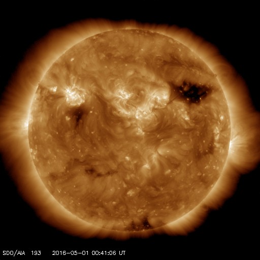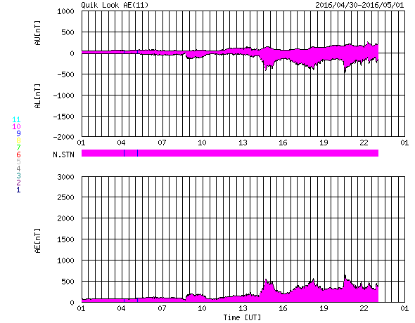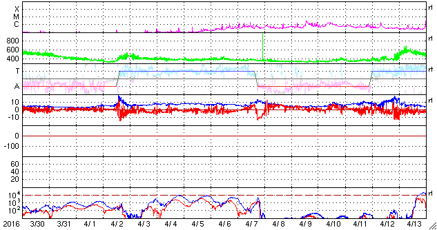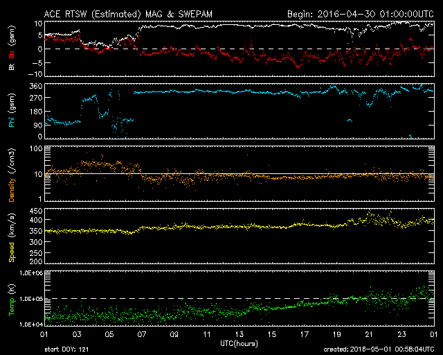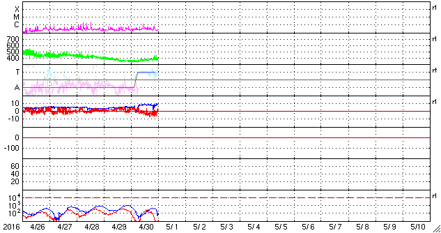 2016/ 5/ 1 09:59 更新 太陽風は平均的な速度で穏やかです。磁気圏の活動が少し高まっています。 担当 篠原 太陽風は、昨日の午後に、 磁場強度が5nTから一時的に弱くなり、 すぐに8nT程度に強まる変化が見られました。 27日周期の図を参照すると、 太陽風磁場の大まかな方向が切り替わる、 セクター境界が来ています。 前周期の4月2日にも、同じような変化が起きています。 磁場強度は、その後も8〜10nTに やや強まった状態が続いています。 太陽風の速度は、350km/秒から400km/秒へゆっくりと上がり、 平均的な速さに戻っていますが、 高速風の到来とはなっていません。 コロナホールの影響は特に見られずに終わるのか、 遅れてこれからやって来るのか、 もうしばらく注目して下さい。 太陽風磁場の南北成分は、セクター境界を越えた後、 -3nT前後と、南寄りの傾向に変わっています。 このため、磁気圏の活動も少し高まっていて、 AE指数は、500nT程度の中規模の変化が 繰り返し発生しています。 太陽は、2539黒点群でC1.2の小規模フレアが発生していますが、 2539群とともに、2537群、2536群でも、 Bクラスの小さいフレアが何度も起きています。 X線のグラフは、値は低いですが、 変化が続いています。