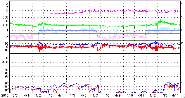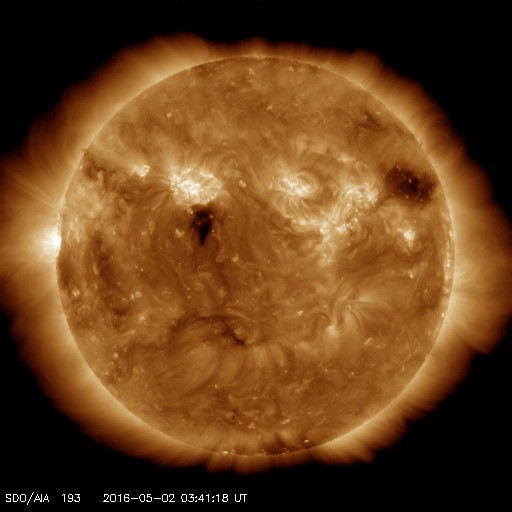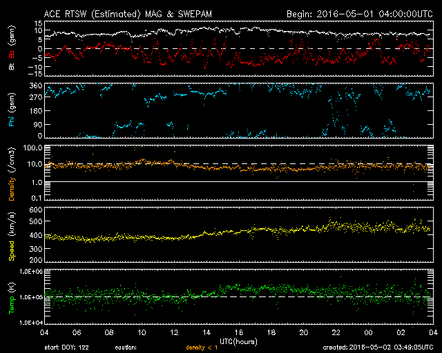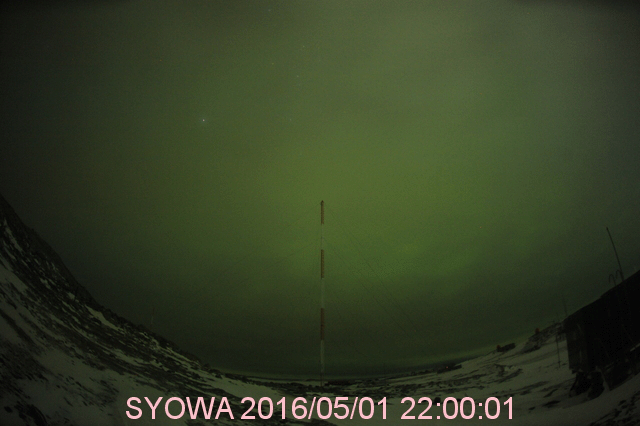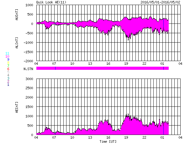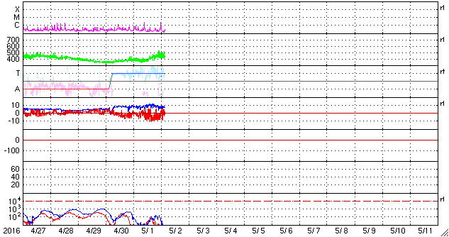 2016/ 5/ 2 12:50 更新 コロナホールによる太陽風の高まりが始まりました。 担当 篠原 昨夜から太陽風の弱い高まりが始まっています。 磁場強度は、既にやや高まっていましたが、 1日23時(世界時1日14時)頃に、 10nTを少し超えるくらいに最も高まりました。 そして、速度がその頃からゆっくりと上がり始め、 400km/秒から450km/秒へ、小幅の変化ですが、 やや高速の状態になっています。 太陽風磁場の南北成分は、南寄りの傾向が続き、 昨夜から今朝にかけて、 -5nTを超えるやや強い南向きが頻繁に発生しました。 このため、磁気圏の活動も高まって、 AE指数では、700nTから1000nTに達する中規模の変化が、 グラフの中盤以降続いています。 世界時1日19時から1日22時にかけて、 AE指数が最も高まった頃の、 南極昭和基地のオーロラの動画を掲載します。 曇り空のため、オーロラそのものはほとんど見えていませんが、 活発な活動の様子が分かります。 現在の太陽風は、磁場強度は7nTへ少し下がっていますが、 速度は450km/秒で安定しています。 コロナホールの影響がどのくらい続くのか、注目してください。 太陽は、2539黒点群で、 C2.4、C2.5の小規模フレアが発生しています。 活動が特に高まっているという様子ではありません。