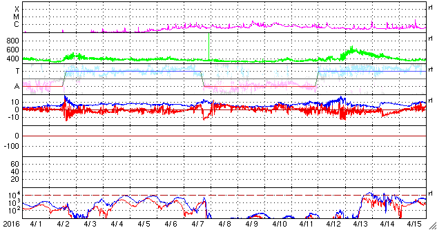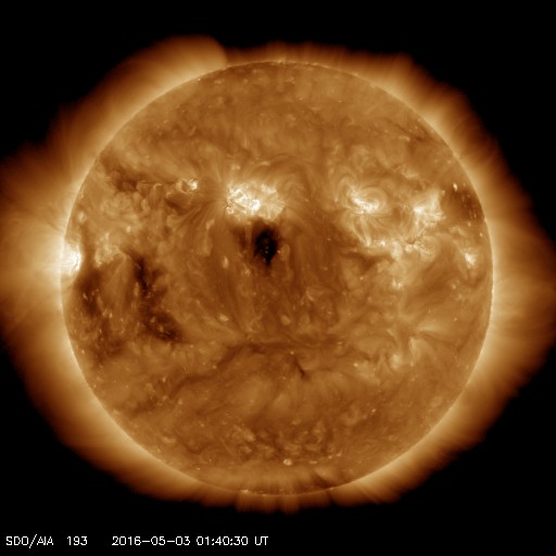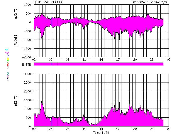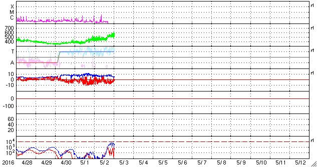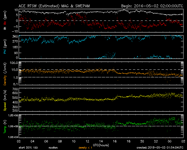 2016/ 5/ 3 10:55 更新 太陽風の速度は550km/秒に上がっています。ニュージーランドのオーロラをどうぞ。 担当 篠原 ニュージーランド・ダニーデンの中村太一さんより、 昨夜、現地2日21時(世界時2日9時)に撮影された オーロラの写真をいただきました。 撮影地は、ダニーデンのブラックヘッドビーチとのことです。 日中は雲が多かったものの、夜が更けるとともに天気は回復し、 月明かりがないことも幸いして、 オーロラが目視で動きがはっきり分かるほど楽しめたとのことです。 太陽風の高まりが続いている中のオーロラです。 AE指数のグラフでは、この時間帯はあまり高まっていないのですが、 AE指数のデータ観測点の分布に関係したずれかもしれません。 水平線の彼方のオーロラの光の筋が、とても美しく見えています。 低い空まで星がきれいに写っているので、 空の状態も良かったのだろうと思います。 撮ったばかりの速報をどうもありがとうございます。 太陽風は、450km/秒というやや高速の状態から、 今日に入ると500km/秒へ一段高まり、 現在は550km/秒まで上がっています。 速度と反対に、磁場強度は、8nTから5nTへ下がり、 平均的な状態に戻っています。 高速太陽風の高まりの中心は、 現在地球に到来している領域だったようです。 27日周期の図を見ると、 前周期(4月5日前後)には全く見られなかった太陽風の高まりです。 太陽風磁場の南北成分は、南寄りの傾向が続いています。 -5nT前後の南向きが長い時間続き、速度の高まりもあって、 磁気圏の活動は更に高まっています。 AE指数は、1000nT前後の活発な変化が長時間続いていて、 極域では、激しいオーロラが発生しているのでしょう。 一方、太陽風の磁場強度が下がり始めているので、 高速風の領域は、次第に後半に入っていくと思われます。 太陽では、2539黒点群の左側の2540群で、 C3.5の小規模フレアが発生しました。 しかし、その後、2540群の黒点は見えなくなっています。 ![]() ニュージーランド南島ダニーデンで、現地2日21時(世界時2日9時)に撮影されたオーロラ。 (c) 中村太一氏 ![]() ニュージーランド南島ダニーデンで、現地2日21時(世界時2日9時)に撮影されたオーロラ。 (c) 中村太一氏 ![]() SDO衛星のAIA193カメラによる太陽コロナの様子 (c) SDO (NASA) ![]() SDO衛星による太陽の可視光写真。マウスの矢印を写真に重ねると、黒点番号付きの写真に切り替わります。 (c) SDO (NASA) ![]() ACEが観測した太陽風の磁場(1番上の枠、白線は全体の強度、赤線は南北成分) および、太陽風の密度(3番目の橙線)、速度(4番目の黄線) (c) NOAA/SWPC ![]() リアルタイムAE指数 下段のAEグラフの値が高くなると、オーロラ活動が活発化しています。 (c) 京都大学, NICT ![]() 27日の太陽周期に合わせたデータプロット 太陽が同じ面を地球に向けていた27日前の変化から、今後を予想することができます。 (c) 作図:宇宙天気ニュース