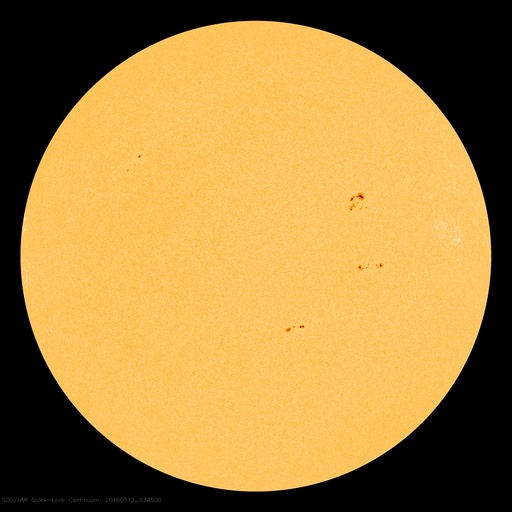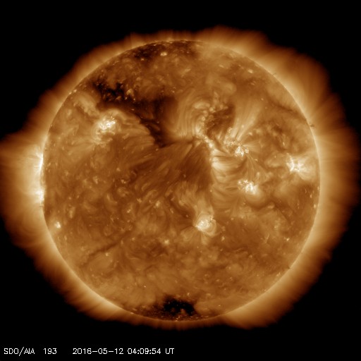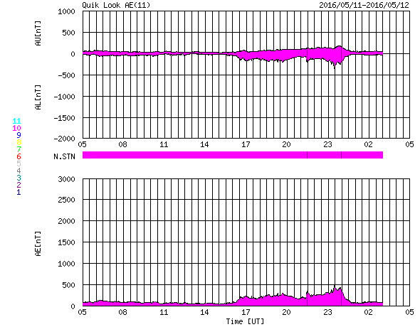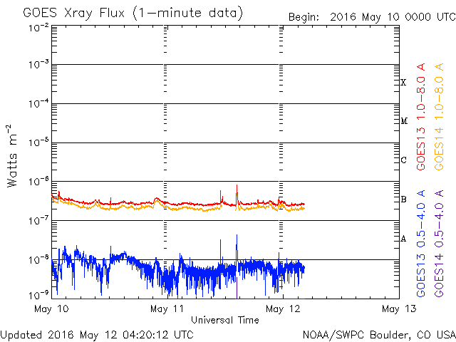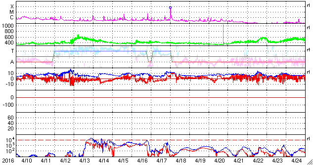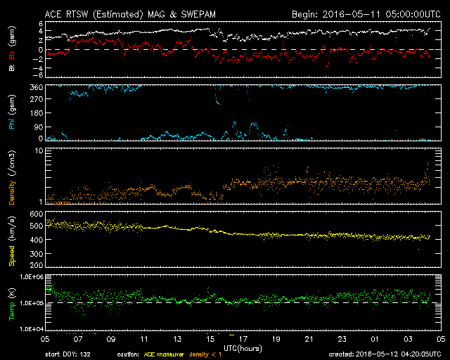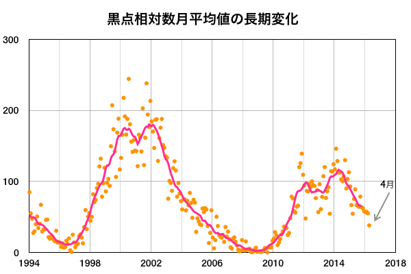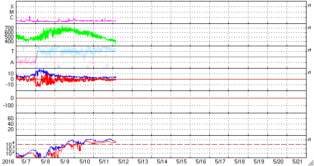 2016/ 5/12 13:21 更新 太陽風は平均的な状態に戻っています。4月の黒点数は 38.0 でした。 担当 篠原 お知らせするのが遅くなりましたが、 4月の黒点相対数は、38.0とWDC-SILSOより発表されています。 40を割って低くなったのは、2011年1月の27.3以来です。 一日毎の数値を見ると、 3月下旬から4月中旬にかけて、30前後の低い日が続たため、 平均値が下がる結果になったようです。 4月の終わりには、80前後に再び高まっているので、 5月の平均値は、元のレベルに戻るかもしれません。 太陽風の速度は、ゆっくりと低下が続き、 現在は400km/秒と平均的な速さに戻っています。 磁場強度は、3〜4nTとやや弱めです。 磁場の南北成分は、弱い南寄りとなっています。 速度も下がってきたので、磁気圏への影響は弱くなり、 AE指数は250nTの小規模の変化になっています。 高速太陽風は通り過ぎて、しばらく穏やかな状態になりそうです。 太陽は、目立ったフレアの発生はなく、 静かな状態が続いています。 放射線帯の高エネルギー電子は、 10万に達するたいへん高い状態が続いています。 太陽風が落ち着いたので、 高エネルギー電子はゆっくりと減少するでしょう。