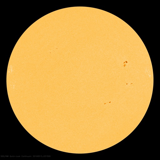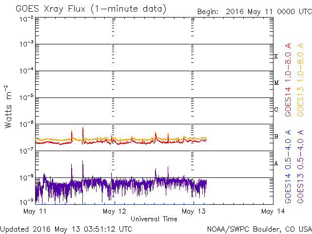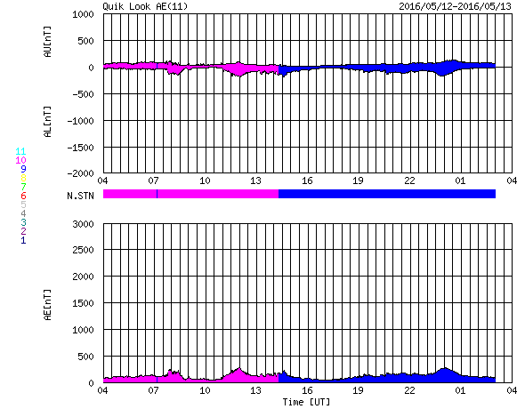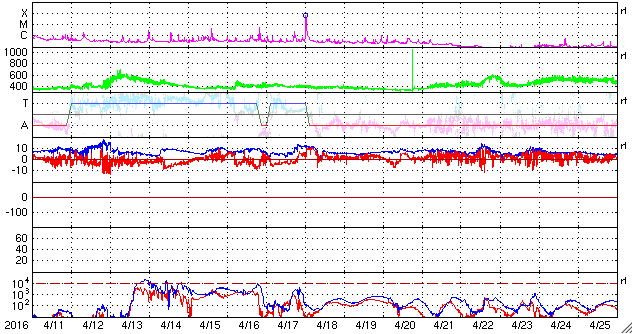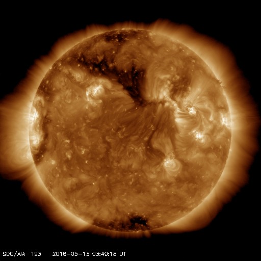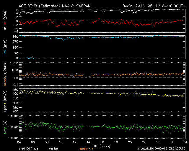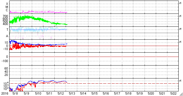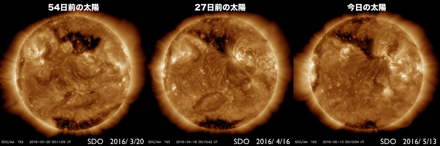 2016/ 5/13 12:51 更新 太陽風はやや低速で、磁気圏も比較的穏やかです。 担当 篠原 太陽風の速度は、370km/秒へ下がり、 やや低速の風になっています。 磁場強度は、4nTから6nTへ上がる変化が見えていますが、 値としては平均的な状態です。 27日周期の図では、前周期の太陽風は、 400km/秒前後の速度が続いています。 今回も同様の変化となるかもしれません。 太陽風磁場の南北成分は、 0nT付近から弱い南寄りになっています。 AE指数は、200nTの小さい変化が起きている程度で、 比較的穏やかです。 SDO衛星AIA193の太陽写真では、 北半球の中央部にコロナホールが広がっています。 27日前と同じような広がりになっていて(1枚目の図を参照)、 前周期と同様に太陽風への影響は見られないのか、 今回は変化が到来するのか、 16日以降の太陽風の推移に注目して下さい。 太陽は、フレアの発生はなく、静かな状態が続いています。 放射線帯の高エネルギー電子は、少し下がり、 GOES15(青線)は、10万には届いていません。 しかし、かなり高まった状態は続いています。 ![]() 2周期前(54日前)、1周期前(27日前)、現在のコロナホールの様子。SDO衛星AIA193。 (c) SDO (NASA)、作図:宇宙天気ニュース ![]() SDO衛星のAIA193カメラによる太陽コロナの様子 (c) SDO (NASA) ![]() SDO衛星による太陽の可視光写真。マウスの矢印を写真に重ねると、黒点番号付きの写真に切り替わります。 (c) SDO (NASA) ![]() ACEが観測した太陽風の磁場(1番上の枠、白線は全体の強度、赤線は南北成分) および、太陽風の密度(3番目の橙線)、速度(4番目の黄線) (c) NOAA/SWPC ![]() リアルタイムAE指数 下段のAEグラフの値が高くなると、オーロラ活動が活発化しています。 (c) 京都大学, NICT ![]() 27日の太陽周期に合わせたデータプロット 太陽が同じ面を地球に向けていた27日前の変化から、今後を予想することができます。 (c) 作図:宇宙天気ニュース