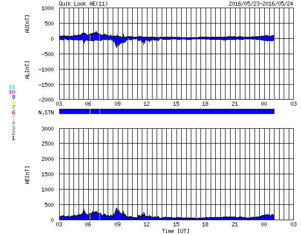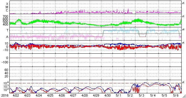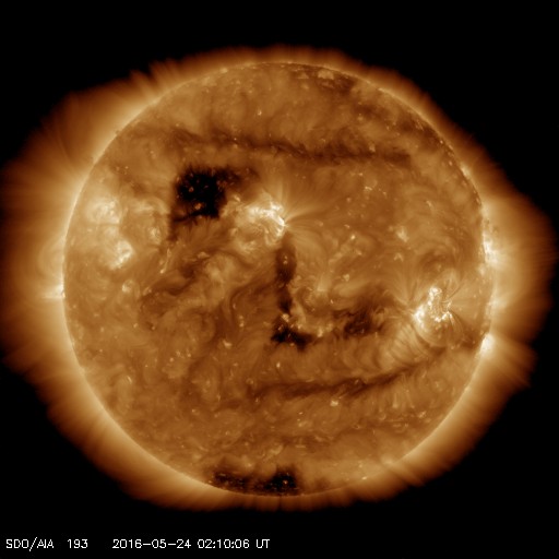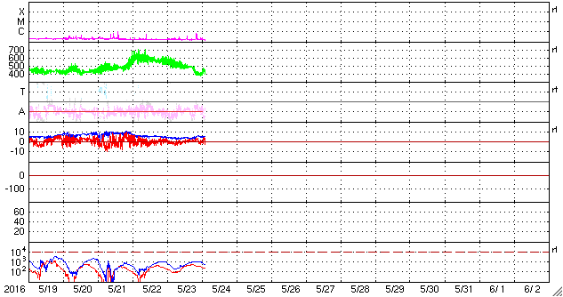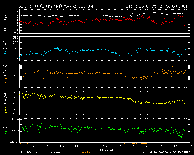 2016/ 5/24 11:27 更新 太陽風は平均的な速度に下がりました。太陽は穏やかです。 担当 篠原 太陽風は、今朝、24日3時(世界時23日18時)頃まで、 500km/秒程度の高速風が続きましたが、 その後、急に速度が下がり、 現在は400km/秒と平均的な状態に戻っています。 磁場強度は、4nTから5nTへ少し変化していますが、 こちらも平均的な値です。 高速の太陽風は、3日ほどで通り過ぎたようです。 太陽風磁場の南北成分は、0nT付近で小さく変化しています。 磁気圏への影響も小さく、 AE指数は、速度の高かった前半に、 300nTの小規模の変化が起きている程度です。 SDO衛星AIA193の太陽コロナ写真では、 北東側(左上)に、コロナホールが広がっています。 27日周期の図を見ると、 前周期は5月2日頃から影響が始まっているようです。 今回も、5日後の29日あたりから、 太陽風の高まりがやって来るかもしれません。 太陽は、2546黒点群が西の端に近づいています。 この他に黒点は見られず、X線の変化も小さいものだけです。 ![]() SDO衛星のAIA193カメラによる太陽コロナの様子 (c) SDO (NASA) ![]() SDO衛星による太陽の可視光写真。マウスの矢印を写真に重ねると、黒点番号付きの写真に切り替わります。 (c) SDO (NASA) ![]() ACEが観測した太陽風の磁場(1番上の枠、白線は全体の強度、赤線は南北成分) および、太陽風の密度(3番目の橙線)、速度(4番目の黄線) (c) NOAA/SWPC ![]() リアルタイムAE指数 下段のAEグラフの値が高くなると、オーロラ活動が活発化しています。 (c) 京都大学, NICT ![]() 27日の太陽周期に合わせたデータプロット 太陽が同じ面を地球に向けていた27日前の変化から、今後を予想することができます。 (c) 作図:宇宙天気ニュース