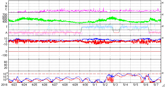 - 2016/ 5/21 10:19 太陽風は430km/秒付近で安定し、磁気圏も穏やかです。