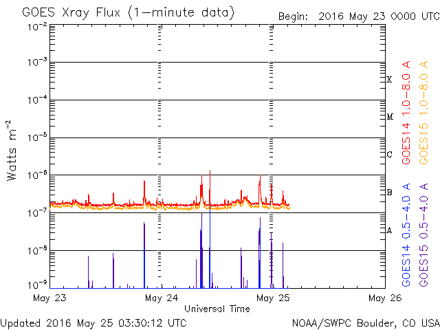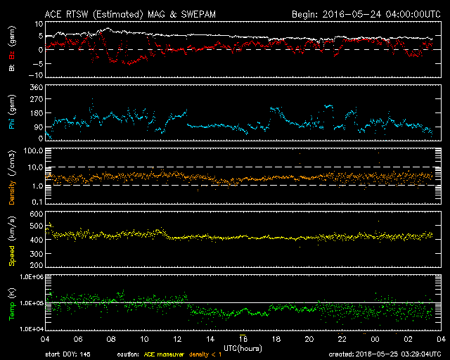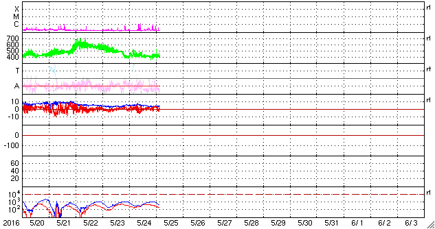 - 2016/ 5/24 11:27 太陽風は平均的な速度に下がりました。太陽は穏やかです。