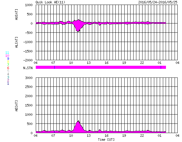 下段のAEグラフの値が高くなると、オーロラ活動が活発化しています。