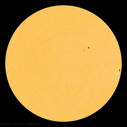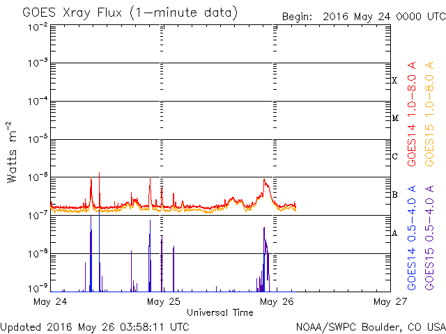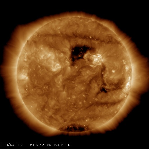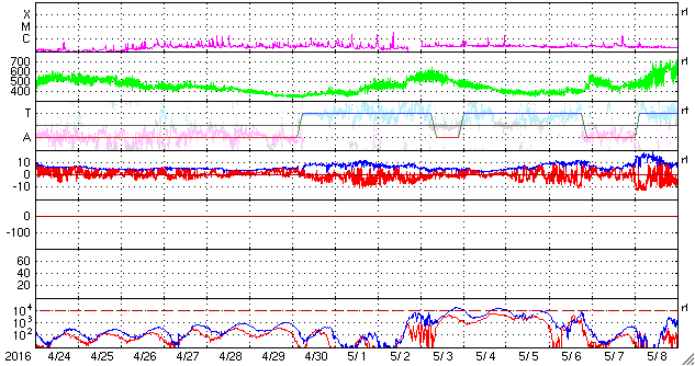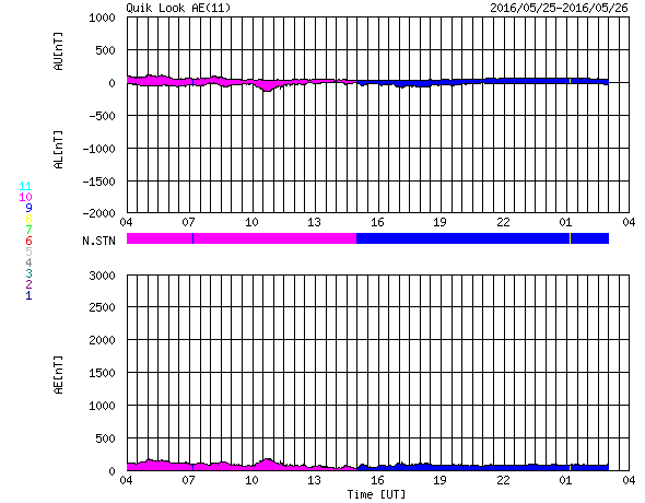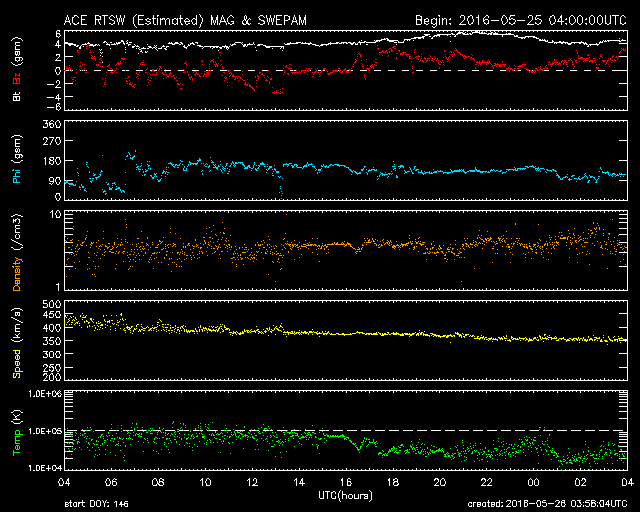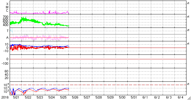 2016/ 5/26 12:58 更新 太陽風の速度が下がり、低速風になっています。 担当 篠原 太陽風の速度は、350km/秒へ下がり、 低速の風に変わっています。 磁場強度は、4〜5nTと平均的な値です。 27日周期の図を見ると、 前周期も、4月29〜30日にかけて、 太陽風の速度が300km/秒台へ下がっています。 この時は、5月2日以降、太陽風の速度が高まりました。 今回も、SDO衛星AIA193の太陽写真を見ると、 中央部の北半球側にコロナホールがあり、 2〜3日後くらいから影響が及び始めるかもしれません。 太陽風磁場の南北成分は、 比較的北寄りに推移しています。 磁気圏は静穏で、AE指数のグラフは変化が見られません。 太陽は、2546黒点群が西の端に近づいて、 もうすぐ見えなくなります。 新しい2548群は、小さい活動が活発に起きていて、 規模が更に大きくなるようであれば、 注意が必要になるでしょう。