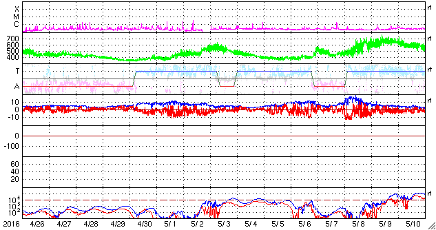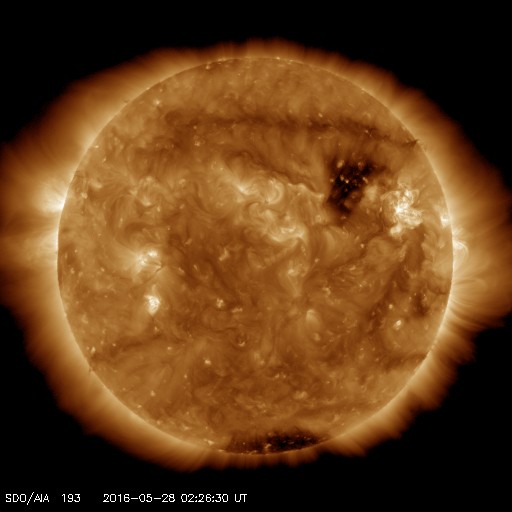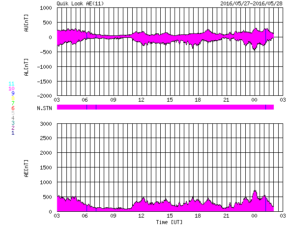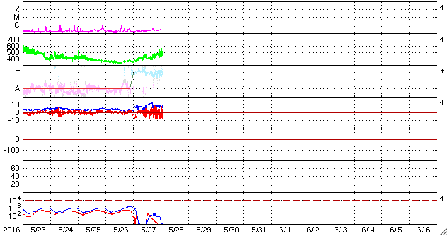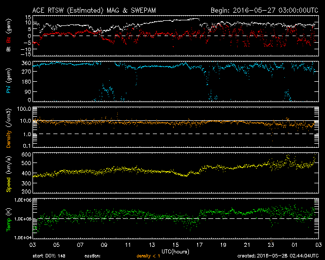 2016/ 5/28 11:44 更新 太陽風の速度が次第に高まり、磁気圏の活動もやや高まっています。 担当 篠原 太陽風の速度は、 昨日のニュース以降、400km/秒で推移し、 今日に入ると、450km/秒へ高まりました。 そして、現在は500km/秒と高速風に変わりつつあります。 前周期より少し早まっていますが、 コロナホールの影響が始まったようです。 太陽風の磁場強度は、 8nT前後にやや強まった状態が続いています。 このため、太陽風の速度は更に高まる可能性があります。 SDO衛星AIA193の太陽写真では、 コロナホールは地球へ影響が及び始める目安の位置に達したところです。 引き続き太陽風の高まりに注目してください。 太陽風磁場の南北成分は、南北に小刻みに変化しています。 このため、磁気圏の活動もやや高まっていて、 AE指数は、小中規模の変化が連続的に発生しています。 今後、速度が高まると、磁気圏への影響も強まって、 磁気圏の活動はより活発になる可能性があります。 太陽は、北西(右上)に2548黒点群と、 南東(左下)に新しい黒点が発生しているようです。 フレアの発生は特になく、穏やかな状態が続いています。 ![]() SDO衛星のAIA193カメラによる太陽コロナの様子 (c) SDO (NASA) ![]() SDO衛星による太陽の可視光写真。マウスの矢印を写真に重ねると、黒点番号付きの写真に切り替わります。 (c) SDO (NASA) ![]() ACEが観測した太陽風の磁場(1番上の枠、白線は全体の強度、赤線は南北成分) および、太陽風の密度(3番目の橙線)、速度(4番目の黄線) (c) NOAA/SWPC ![]() リアルタイムAE指数 下段のAEグラフの値が高くなると、オーロラ活動が活発化しています。 (c) 京都大学, NICT ![]() 27日の太陽周期に合わせたデータプロット 太陽が同じ面を地球に向けていた27日前の変化から、今後を予想することができます。 (c) 作図:宇宙天気ニュース