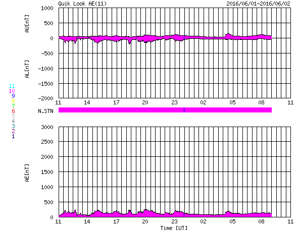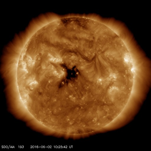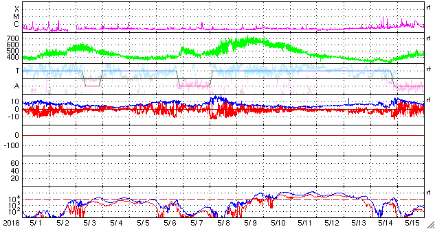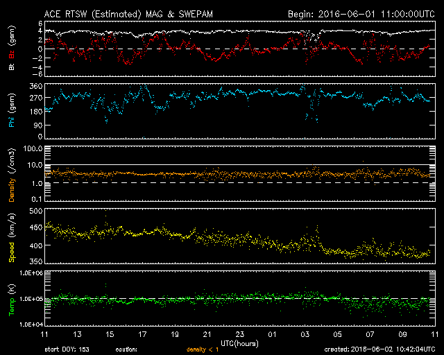 2016/ 6/ 2 19:42 更新 太陽風の速度は下がり、やや低速になっています。太陽の黒点が見えなくなりそうです。 担当 篠原 太陽風速度の高まりは、終わっています。 昨日のニュース以降、太陽風の速度はゆっくりと下がり、 今朝には、400km/秒と平均的な速さに戻っていました。 そして、現在はもう一段下がり、 370km/秒とやや低速の状態になっています。 磁場強度は、4nTで安定しています。 南北成分は、南北にゆっくりと変化していますが、 振れ幅は小さくなり、 速度の低下と重なって磁気圏への影響は弱まっています。 このため、AE指数の変化は小さくなっています。 SDO衛星AIA193では、 太陽の中心部にコロナホールが見えています。 3日後くらいから、 この領域の影響で太陽風がやや強まる可能性があります。 太陽は、2550群と2551群の2つの領域が西の端に近づき、 明日くらいで見えなくなりそうです。 その他の領域に、今のところ黒点は見えていないため、 太陽は無黒点の状態になるかもしれません。 明日の太陽面はどうなっているでしょうか。 注目して下さい。 今日は用件が重なってしまい、記事の更新が遅くなりました。 申し訳ありません。 ![]() SDO衛星のAIA193カメラによる太陽コロナの様子 (c) SDO (NASA) ![]() SDO衛星による太陽の可視光写真。マウスの矢印を写真に重ねると、黒点番号付きの写真に切り替わります。 (c) SDO (NASA) ![]() ACEが観測した太陽風の磁場(1番上の枠、白線は全体の強度、赤線は南北成分) および、太陽風の密度(3番目の橙線)、速度(4番目の黄線) (c) NOAA/SWPC ![]() リアルタイムAE指数 下段のAEグラフの値が高くなると、オーロラ活動が活発化しています。 (c) 京都大学, NICT ![]() 27日の太陽周期に合わせたデータプロット 太陽が同じ面を地球に向けていた27日前の変化から、今後を予想することができます。 (c) 作図:宇宙天気ニュース