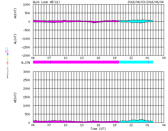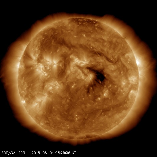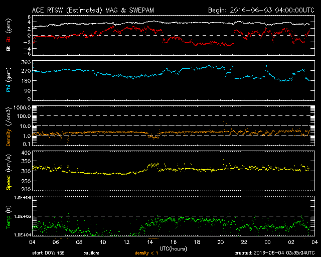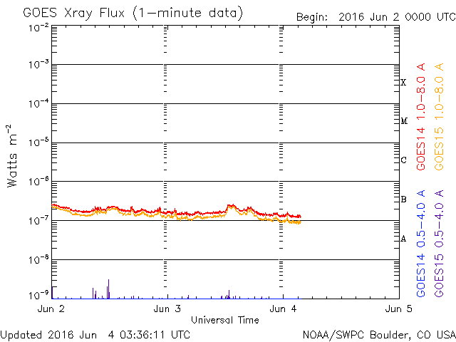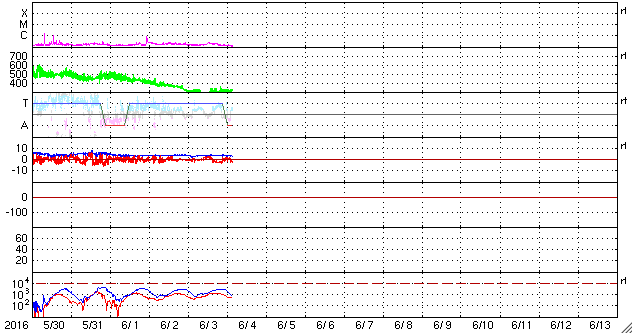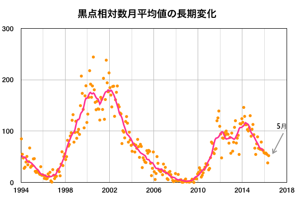 2016/ 6/ 4 12:37 更新 太陽は無黒点が続いています。5月の黒点数は 52.1 でした。 担当 篠原 WDC-SILSOより、 5月の黒点相対数は、52.1 と発表されました。 4月に、38と一旦下がりましたが、 5月はそれ以前の流れに戻っています。 2014年末に100を割って以来、1年半で半分に下がっています。 第23期の後半を見ると、黒点数の減少ペースは、 下がるにつれて、次第にゆっくりになっています。 今後の下がり方も、次第に変化が小さくなっていくかもしれません。 その太陽は、今日も黒点は見えていないようです。 NOAAの活動領域のリストにも、番号は書かれていません。 来月初めにWDC-SILSOから発表される 黒点数データを待つことになりますが、 2014年7月以来、2年ぶりの無黒点日になりそうです。 前回は、月平均値が、まだ100を超えている中で 突発的に発生した無黒点日でしたが、 今後は、このような日が次第に増加していくでしょう。 X線のグラフに変化は特になく、太陽はとても穏やかです。 太陽風は、速度が300km/秒付近で安定し、 低速の状態が続いています。 磁場強度も、3nTにやや弱まっています。 AE指数はほとんど変化がなく、磁気圏も静かです。 太陽中央部のコロナホールは、西に少し進み、 この後、太陽風に影響が見られるのかどうか、注目して下さい。