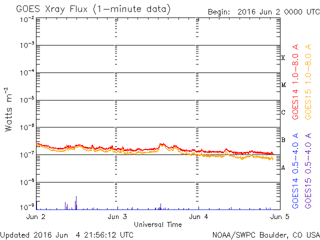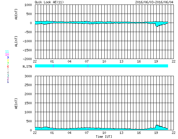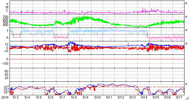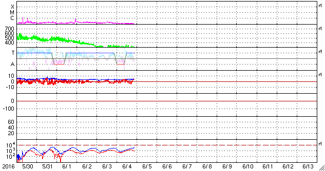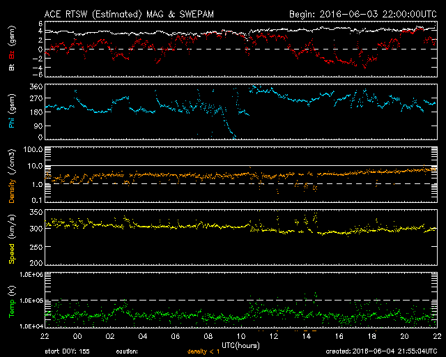 2016/ 6/ 5 06:56 更新 太陽に黒点は見られません。太陽風は300km/秒と低速です。 担当 篠原 現在も太陽には、 はっきり分かるほどの黒点は現れていません。 SDO衛星の拡大写真では、 中央の左上あたりに非常に小さい点が見えていて、 黒点なのかもしれません。 NOAA/SWPCの報告ではどうなっているでしょうか。 フレアの発生はなく、太陽はとても静かです。 太陽風の速度は、300km/秒付近で安定していて、 一時的に、300km/秒台を割っているところもあります。 磁場強度は、4nTと少し戻しています。 磁気圏も静穏で、 AE指数のグラフは、小さい変化が一時的に起きている程度です。 SDO衛星AIA193では、コロナホールが西に進んでいます。 この領域の影響が、どの程度やって来るでしょうか。 この部分を過ぎると、その後にコロナホールはなく、 太陽風は穏やかな状態が続きそうです。
