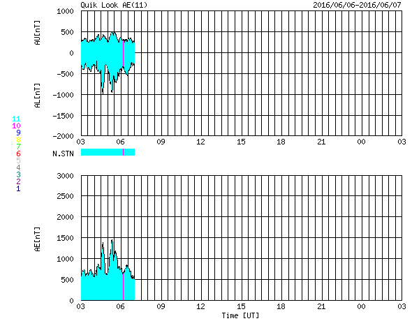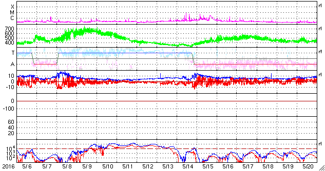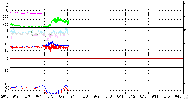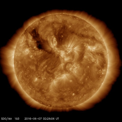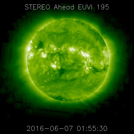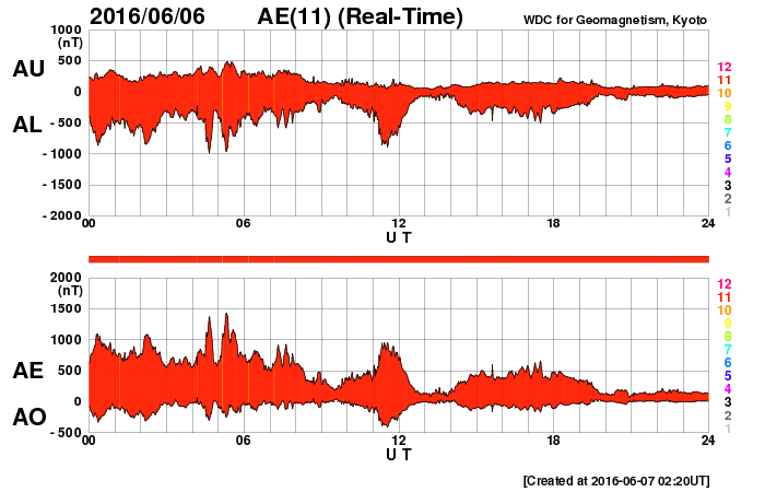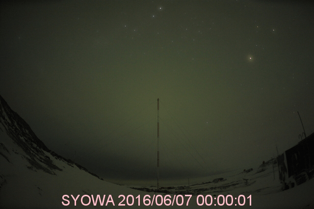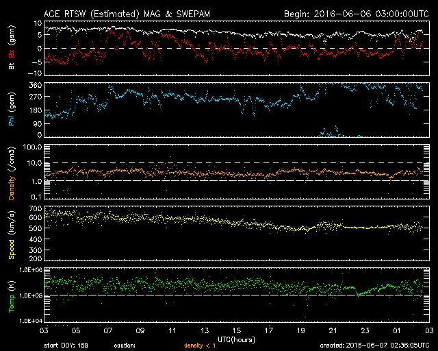 2016/ 6/ 7 11:38 更新 高速太陽風は続いていますが、速度は下がり始めています。太陽は無黒点です。 担当 篠原 太陽風の速度は、600km/秒から500km/秒に下がりましたが、 依然、高速の風が続いています。 磁場強度は、7nTから5nTへ下がり、 平均的な状態に戻っています。 高速太陽風は、ピークを過ぎ、後半に入っているようです。 太陽風磁場の南北成分は、変化が次第に小さくなり、 0nT付近に留まるようになっています。 太陽風の速度が下がってきたことも重なって、 磁気圏の活動は次第に小さくなっています。 AE指数のグラフは(2枚目に京都大学WDCの図を掲載しています)、 変化の大きさが、1000nTから500nTに下がり、 さらに、200nT程度に弱くなっています。 その中でも、南極の昭和基地ではオーロラが撮影されています。 昨日に続いて、動画を掲載します。 天の川と重なって、美しい光景です。 高速の太陽風は、この後も次第に速度を下げていくでしょう。 続いて太陽風に影響を及ぼす可能性のあるコロナホールが、 SDO衛星AIA193の太陽の北東部(左上)に現れています。 変化が始まるのは、4〜5日後くらいになりそうです。 太陽は、今日も黒点が見えません。 X線のグラフも、低いレベルで平坦になっていて、 目立った活動が起きていないことを示しています。 一方、STEREO Ahead衛星で、 太陽の東端の向こう側を見ると、 赤道付近に活動的な領域があるようです。 この領域が現れれば、無黒点の状態も終わりそうです。 ![]() 南極の昭和基地で、世界時6日21時〜7日2時に観測されたオーロラ(表示は、世界時+3時)。 (c) 情報通信研究機構、(動画加工 : 宇宙天気ニュース) ![]() 世界時6月6日のAE指数(速報値)。 (c) 京都大学WDC ![]() STEREO Ahead衛星による、太陽の東端の向こう側。 (c) STEREO (NASA) ![]() SDO衛星のAIA193カメラによる太陽コロナの様子 (c) SDO (NASA) ![]() SDO衛星による太陽の可視光写真。マウスの矢印を写真に重ねると、黒点番号付きの写真に切り替わります。 (c) SDO (NASA) ![]() ACEが観測した太陽風の磁場(1番上の枠、白線は全体の強度、赤線は南北成分) および、太陽風の密度(3番目の橙線)、速度(4番目の黄線) (c) NOAA/SWPC ![]() リアルタイムAE指数 下段のAEグラフの値が高くなると、オーロラ活動が活発化しています。 (c) 京都大学, NICT ![]() 27日の太陽周期に合わせたデータプロット 太陽が同じ面を地球に向けていた27日前の変化から、今後を予想することができます。 (c) 作図:宇宙天気ニュース