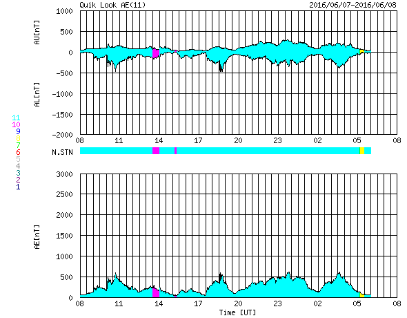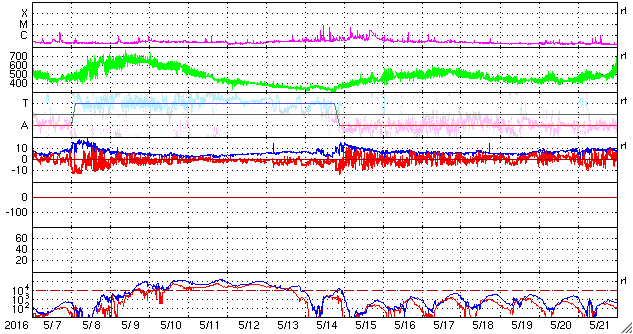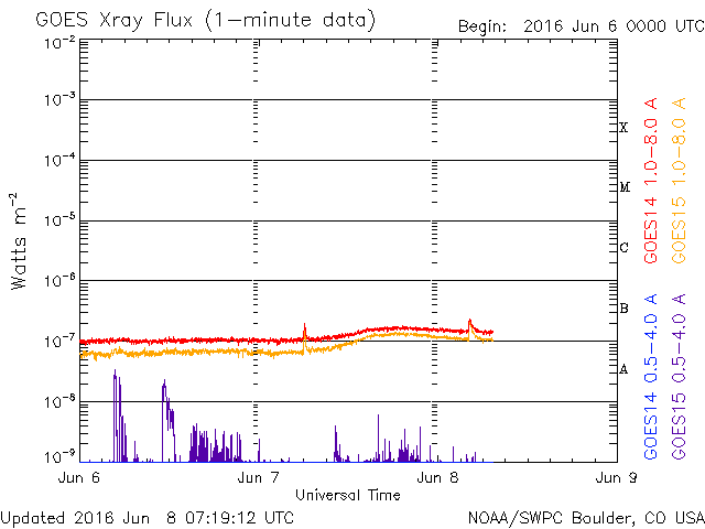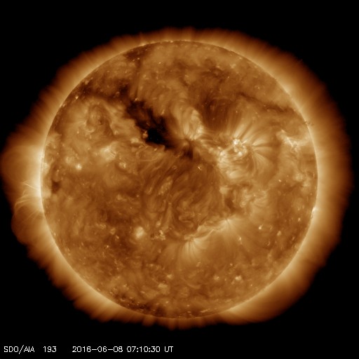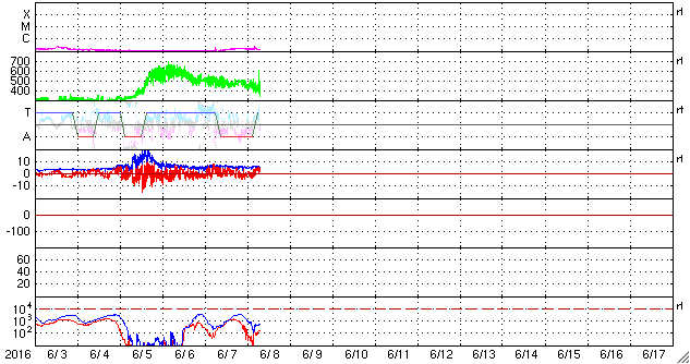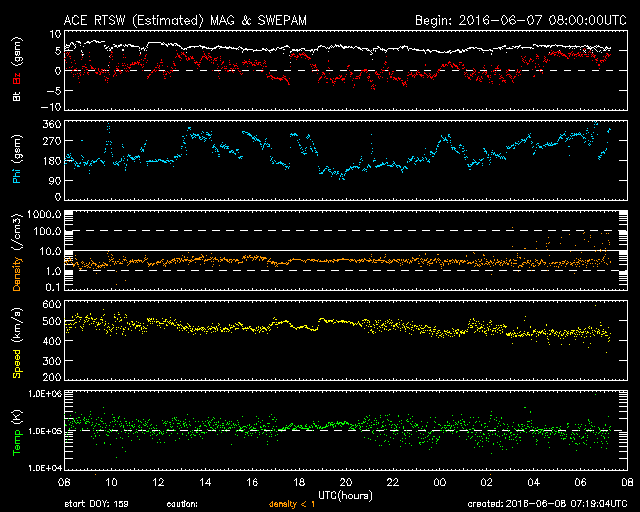2016/ 6/ 8 16:19 更新 太陽に5日ぶりに黒点が現れています。高速の太陽風は終わりつつあります。 担当 篠原 太陽の中央部の北西側(右上)に、2552黒点群が発生しました。 NOAAの黒点群のリストでは、 6月4日から7日まで、4日間無黒点の日が続き、 5日めの今日、新しい黒点群の番号がつきました。 SDO衛星の写真では、昨夜くらいから黒点が見え始めていました。 この時には、中央部の別の2か所にも黒点が見えていましたが、 それらはすぐに消えています。 X線のグラフに目立った変化はなく、 太陽は、穏やかな状態が続いています。 太陽風は、速度が450km/秒まで下がり、 やや高速程度になっています。 磁場強度は、5nT前後で安定しています。 磁場の南北成分は、南向きには小さく変化する程度ですが、 AE指数のグラフは、ある程度活動的で、 500nTの中規模の変化が一日にわたって発生しています。 高速の太陽風はそろそろ終わり、 一旦、穏やかな風になるでしょう。 SDO衛星AIA193では、 次のコロナホールが太陽の中心線に達していて、 3日後くらいからは、この領域の影響で、 太陽風が再び高まるかもしれません。 ![]() SDO衛星のAIA193カメラによる太陽コロナの様子 (c) SDO (NASA) ![]() SDO衛星による太陽の可視光写真。マウスの矢印を写真に重ねると、黒点番号付きの写真に切り替わります。 (c) SDO (NASA) ![]() GOES衛星の太陽X線データ (c) NOAA/SWPC ![]() ACEが観測した太陽風の磁場(1番上の枠、白線は全体の強度、赤線は南北成分) および、太陽風の密度(3番目の橙線)、速度(4番目の黄線) (c) NOAA/SWPC ![]() リアルタイムAE指数 下段のAEグラフの値が高くなると、オーロラ活動が活発化しています。 (c) 京都大学, NICT ![]() 27日の太陽周期に合わせたデータプロット 太陽が同じ面を地球に向けていた27日前の変化から、今後を予想することができます。 (c) 作図:宇宙天気ニュース