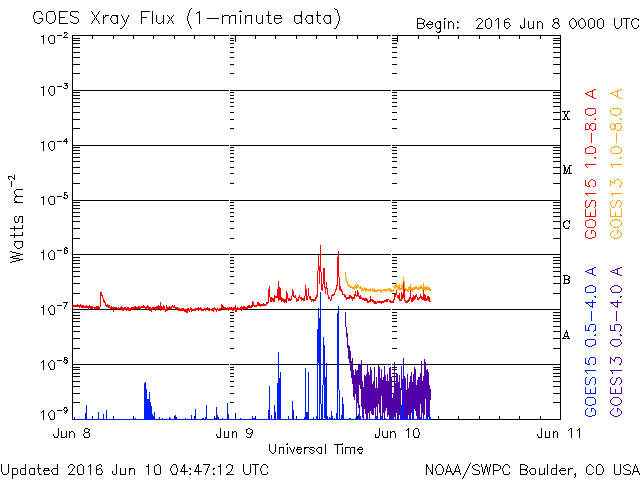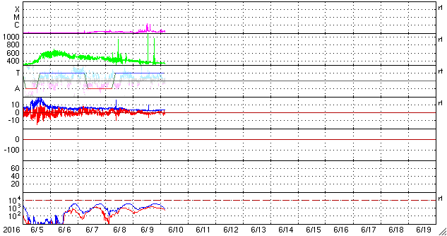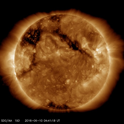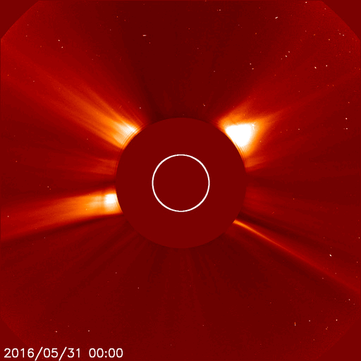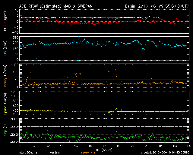 2016/ 6/10 13:47 更新 10日ぶりにC1のフレアが発生しました。太陽風は低速になっています。 担当 篠原 6月7日に、金星が太陽の向こう側を通過する、 外合を迎えました。 今回の外合は、 太陽との角度が0度0分19秒(Stellariumによる)と非常に小さく、 地球と太陽と金星がほぼ一直線に並んだと言えるものでした。 と言っても、太陽の向こう側の金星を見ることはできないので、 SOHO衛星LASCO C2のコロナグラフで、 金星が太陽を右から左に通過する様子を紹介します。 6月5日に太陽を遮る部分に重なって見えなくなり、 昨日、6月9日に、反対側から姿を現しています。 太陽の中心を通り過ぎる金星の姿を想像して下さい。 太陽では、昨夜、9日21時半(世界時9日12時半)にC1.5、 10日0時(世界時9日15時)にC1.1と、 2552黒点群で小規模フレアが発生しています。 C1に達するフレアは、5月30日以来、10日ぶりです。 また、太陽の東端から新しい黒点が顔を出しています。 再び無黒点になる可能性はしばらくなくなりそうです。 太陽風は、ACE衛星のグラフが見にくくなっていますが、 速度は350km/秒と低速になっています。 磁場強度は、4nTで安定しています。 磁気圏は概ね静穏で、 AE指数は小さい変化が見られる程度です。 SDO衛星AIA193では、 北半球のコロナホールが中央線を通過して、 影響が及び始める目安の位置に近づいています。 27日周期の図を見ると、 前周期は5月15日から次第に速度が高まっています。 今後の太陽風の変化に注目して下さい。