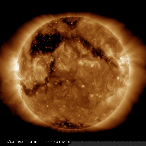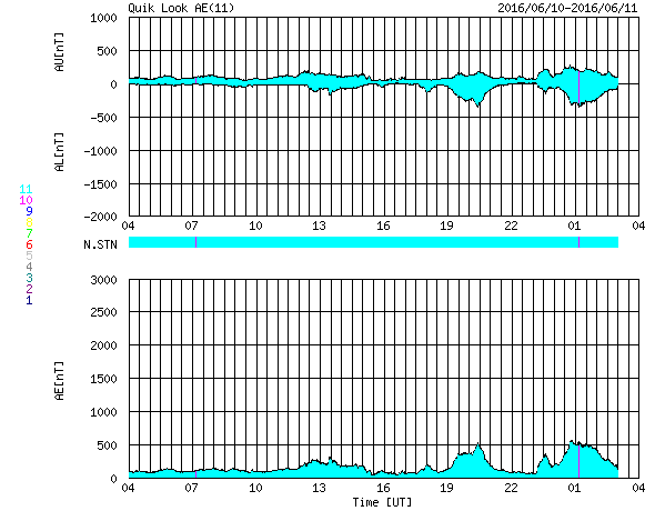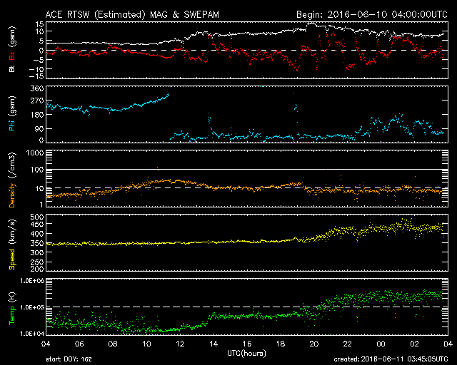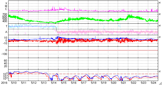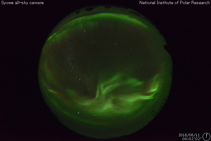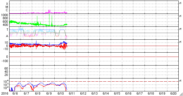 2016/ 6/11 12:46 更新 太陽風磁場が強まり、磁気圏の活動をやや高めています。 担当 篠原 昨夜、10日21時(世界時10日12時)頃から、 太陽風磁場が強まり始め、 11日5時(世界時10日20時)に、15nTまで高まりました。 27日周期の図を見ると、 同じ頃にセクターの切り替わりも発生しています。 前周期の5月14日に見られた変化と 同様の太陽風の乱れがやって来たようです。 磁場が強まると、太陽風の速度も少し上がり、 昨日までは、350km/秒の低速状態でしたが、 現在は430km/秒と平均的な速度に戻っています。 一方、磁場強度はピークを過ぎ、現在は7nTに下がっています。 前周期は、この後更に太陽風の速度が上がり、 500km/秒台の高速風になりました。 今回はどのように推移するでしょうか。 太陽風磁場の南北成分は、変化がやや大きくなり、 -10nTに達する強い南向きも発生しました。 このため、磁気圏の活動も強められ、 AE指数は500nTの中規模の変化が起きるようになっています。 AE指数のグラフの最後の高まりの頃にあたる、 世界時11日0時頃の南極・昭和基地のオーロラの動画を掲載します。 SDO衛星AIA193の太陽写真では、 北半球の東側に大きくコロナホールが広がっています。 前周期よりも広がりが増しているようで、 地球へやって来る太陽風への影響もより大きくなるかもしれません。 太陽は、東端の黒点に2553群と番号が付きました。 X線グラフは、小さい変化が起きている程度です。