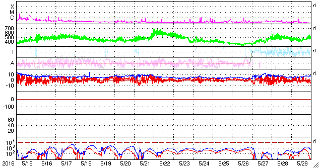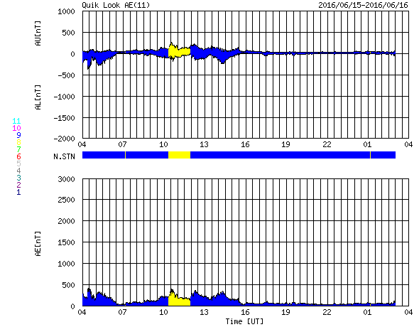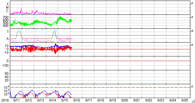 2016/ 6/11 12:46 太陽風磁場が強まり、磁気圏の活動をやや高めています。