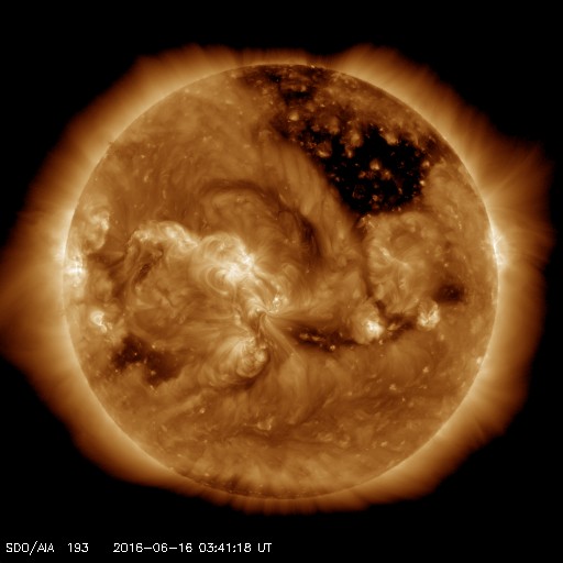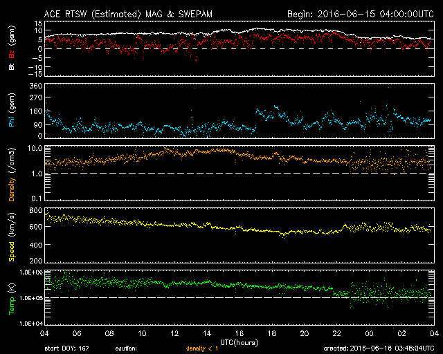 2016/ 6/15 12:40 高速の太陽風が到来して、速度は660km/秒に高まっています。