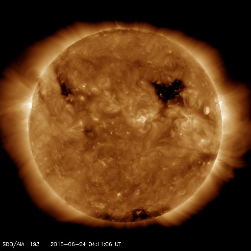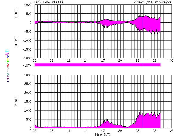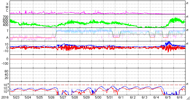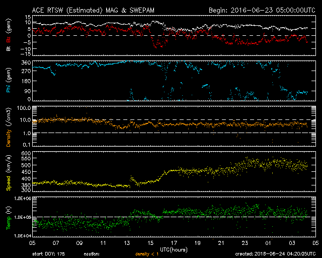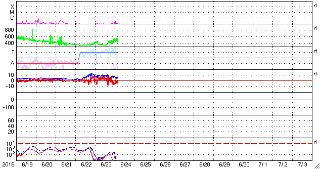 2016/ 6/24 13:22 更新 太陽は無黒点になっています。太陽風は500km/秒の高速風になっています。 担当 篠原 太陽は、およそ2週間ぶりに無黒点になっています。 昨日かすかに見えていた2556黒点群は、 そのまま見えなくなり、 今日のNOAAの黒点群リストも、なしと記載されています。 SDO衛星AIA193では、 太陽の東端(左端)には、明るい領域が見えています。 ここに黒点は発生しているでしょうか。 太陽風は、今日に入った頃から速度が上昇を始め、 今朝くらいに、500km/秒の高速風に達しました。 現在もこの状態が続いています。 反対に、太陽風の磁場強度は、 10nTから5nTへ下がっています。 コロナホールによる高速太陽風が始まったようです。 27日周期の図の前周期と同様の変化になっています。 太陽風磁場の南北成分は、 速度が高まり始めた頃から南寄りに振れるようになり、 磁気圏の活動も強まっています。 AE指数のグラフは、中盤以降、 500〜800nTの中規模の変化が続いています。 前周期は、太陽風の高まりは5日ほど続きました。 今回はどうなるでしょうか。