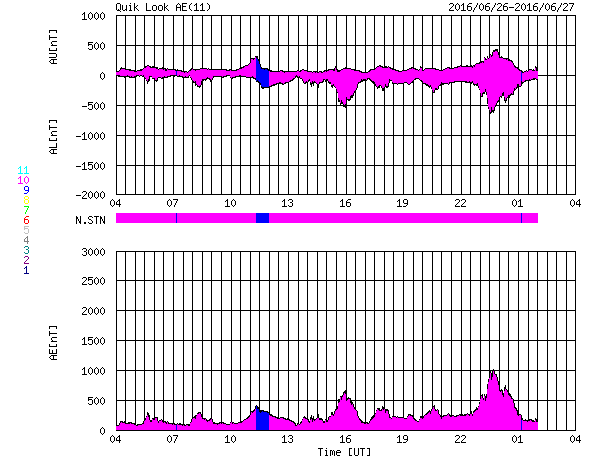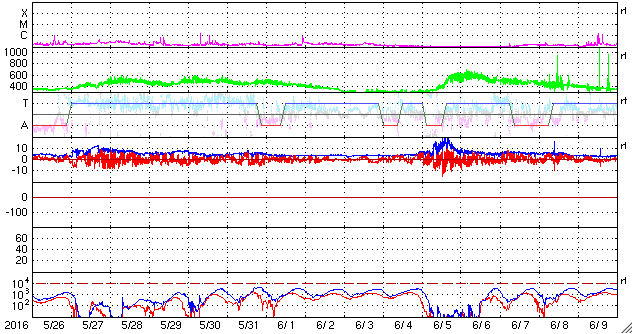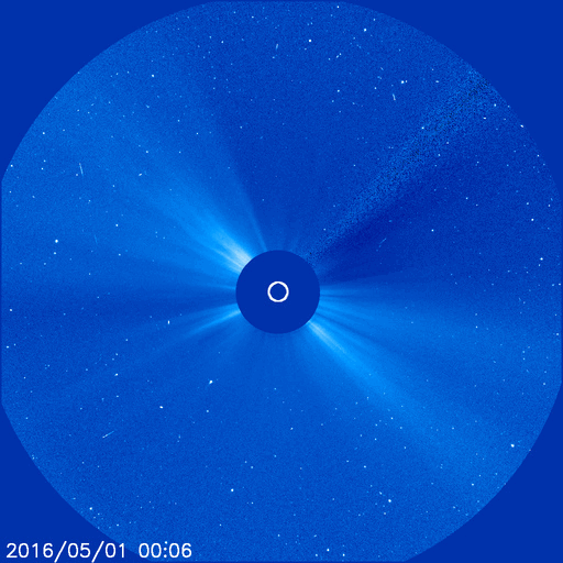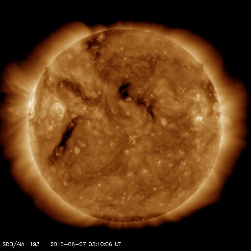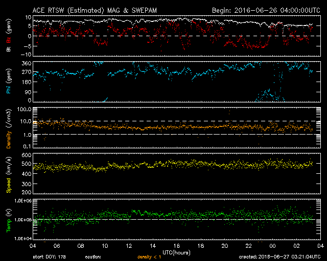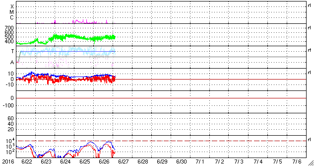 2016/ 6/27 12:22 更新 無黒点は続いています。金星の外合の動画を紹介します。 担当 篠原 6月10日のニュースでお知らせしましたが、 6月7日に、金星が太陽の向こう側を通過する「外合」になりました。 この時の太陽と金星の角度は、 わずか0度0分19秒(Stellariumによる)とたいへん小さく、 記録的な接近だったのではないかと思います。 接近の前後の様子を、 SOHO衛星LASCO C2、C3の動画で紹介します。 金星の通り道をたどると、 白い丸が示している太陽のほぼ中心を通り抜けています。 現在の金星は、C3の写真の左側半分ほどに進んでいます。 もう一週間ほどで画面から外れてしまいそうです。 太陽は、無黒点が続いています。 東端から明るい領域が近づいてきましたが、 現時点では黒点は見えていません。 X線グラフのBクラスの変化は、 太陽の東側の領域で起きていますが、黒点はありません。 太陽風の速度は、再び500km/秒へ高まりました。 27日周期の図の前周期と同じような推移になっています。 現在は、480km/秒で、これ以上高まる様子は見られません。 磁場強度は、昨夜にかけて7〜8nTに少し高まり、 現在は5nTへ下がっています。 南北成分は、北に振れたり、南に振れたり、 ゆっくりと変化しています。 磁気圏でも活動が続いていて、 AE指数は、300nTから、 一時的に1000nTに達する変化まで発生しています。 SDO衛星AIA193では、 太陽の中心部に細長いコロナホールが見えています。 27日前には見られなかったコロナホールです。 今後の太陽風の変化も、 27日前と少し変わるかもしれません。 ![]() 外合により、太陽の向こう側を通り抜ける金星。SOHO衛星LSCO C2、C3。 (c) SOHO (ESA & NASA)、 (動画加工 : 宇宙天気ニュース) ![]() SDO衛星のAIA193カメラによる太陽コロナの様子 (c) SDO (NASA) ![]() SDO衛星による太陽の可視光写真。マウスの矢印を写真に重ねると、黒点番号付きの写真に切り替わります。 (c) SDO (NASA) ![]() GOES衛星の太陽X線データ (c) NOAA/SWPC ![]() ACEが観測した太陽風の磁場(1番上の枠、白線は全体の強度、赤線は南北成分) および、太陽風の密度(3番目の橙線)、速度(4番目の黄線) (c) NOAA/SWPC ![]() リアルタイムAE指数 下段のAEグラフの値が高くなると、オーロラ活動が活発化しています。 (c) 京都大学, NICT ![]() 27日の太陽周期に合わせたデータプロット 太陽が同じ面を地球に向けていた27日前の変化から、今後を予想することができます。 (c) 作図:宇宙天気ニュース
