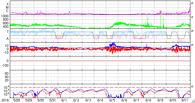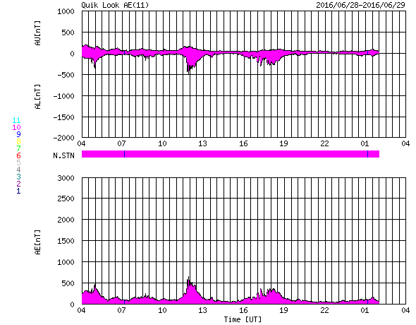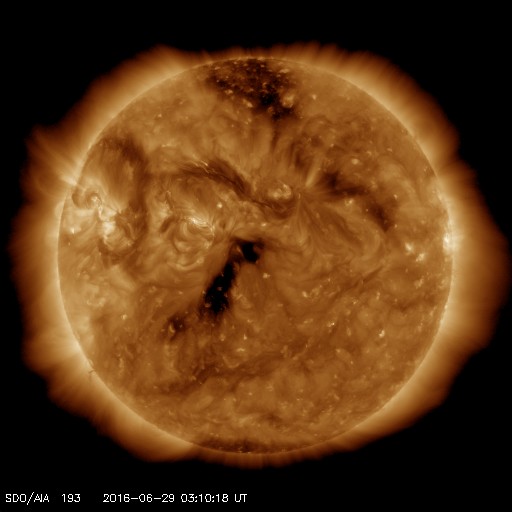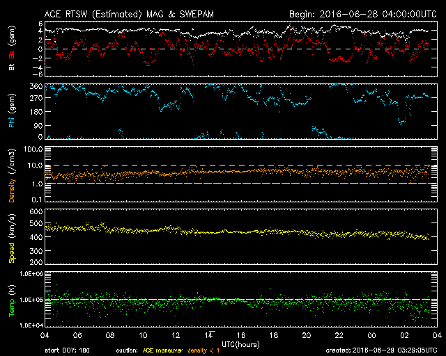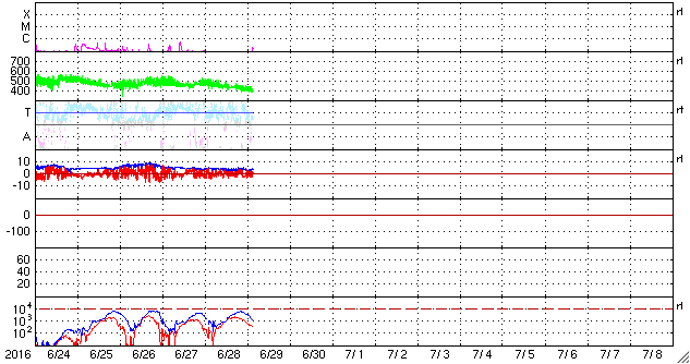 2016/ 6/29 12:30 更新 太陽は無黒点です。太陽風は平均的な状態に戻りました。 担当 篠原 太陽で昨日見えていた小さい黒い点は、 今朝くらいまで残っていましたが、 大きくなることはなく、現在は見えなくなっています。 太陽は、完全に黒点の見えない状態に戻っています。 X線のグラフも、変化がなくなり、 太陽はとても穏やかです。 STEREO Ahead衛星の写真を見ても、 東端のすぐ向こう側に活動的な領域はなく、 無黒点の状態はしばらく続くかもしれません。 太陽風は、速度が400km/秒に下がりました。 磁場強度も4nTで安定していて、 太陽風は平均的な状態に戻っています。 AE指数では、小規模の変化が時々起きていますが、 全体としては穏やかになっています。 SDO衛星AIA193の西側に見えるコロナホールの影響が、 これからやって来るかどうか、 また、現在中央部に見えているコロナホールの影響が、 3日後くらいにやって来るかどうか、 今後の変化の注目点はこの辺りでしょう。