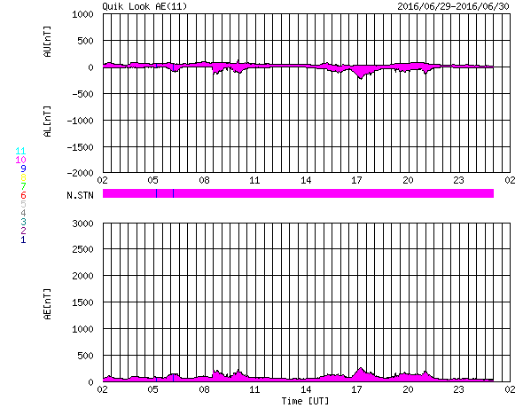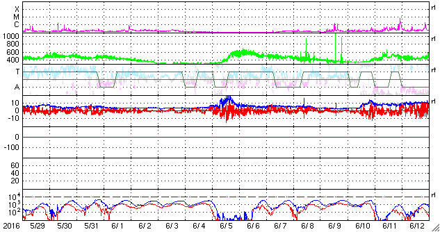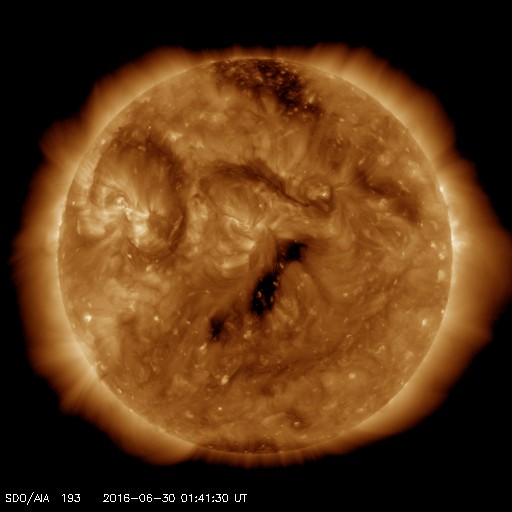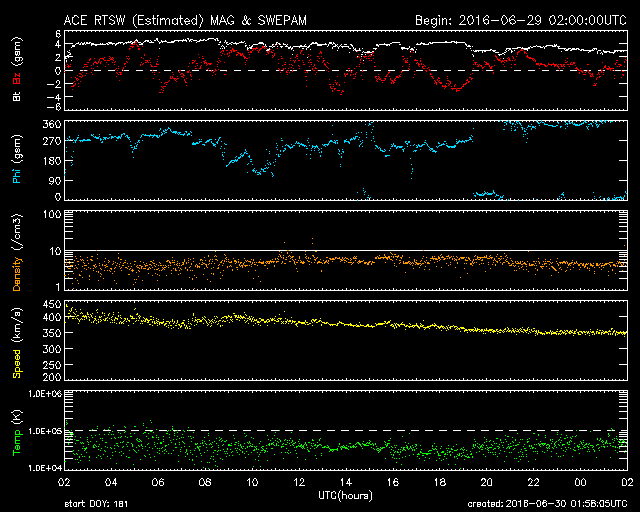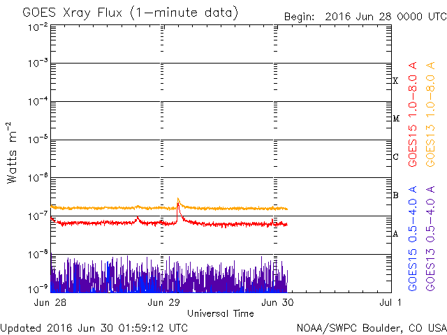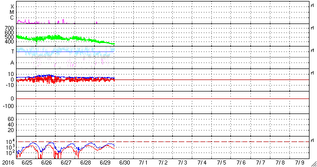 2016/ 6/30 10:59 更新 太陽はとても穏やかです。太陽風は低速になっています。 担当 篠原 太陽は、ほとんど黒点の見えない状態が続いています。 今日のSDO衛星の拡大写真では、 東側(左側)の中ほどに、とても小さい点が見えています。 この領域が、これから大きくなるのか、 一昨日の点のように、すぐ消えてしまうのか、 この後の変化に注目してください。 X線グラフもほとんど変化がなく、 太陽は穏やかな状態が続いています。 太陽風の速度は、ゆっくりと低下が続き、 今朝には、350km/秒と低速の状態になりました。 磁場強度も、4nTから3nTへ弱まりつつあるようです。 磁気圏も、より穏やかになっていて、 AE指数は、200nTの小さい変化が時々起きている程度です。 SDO衛星AIA193では、 コロナホールが太陽の中心線に達しています。 27日周期の図を見ると、この領域による太陽風への影響は、 前周期は世界時6月5日に始まっています。 これは、今回の7月2日に相当します。 明後日くらいから、太陽風の高まりが回帰しそうです。