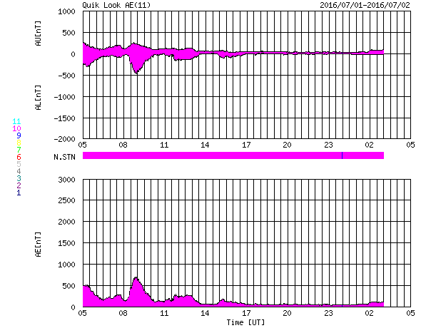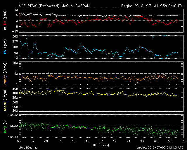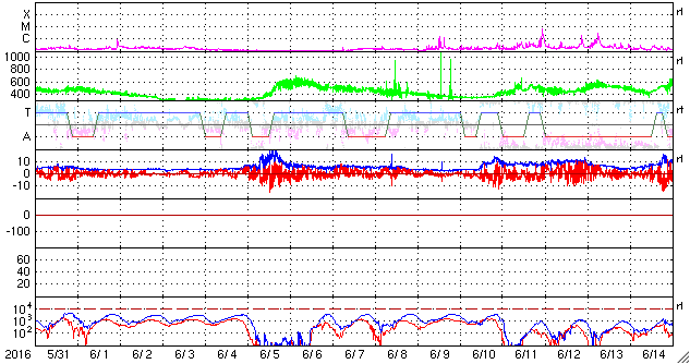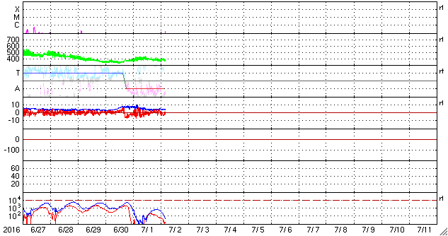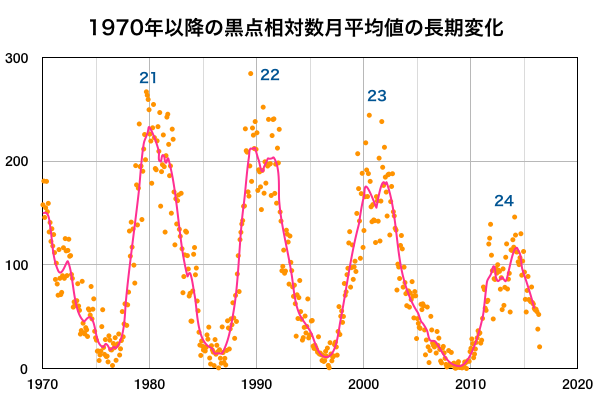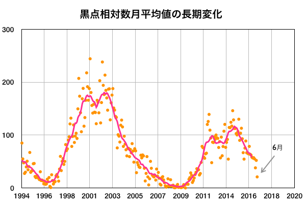 2016/ 7/ 2 13:15 更新 6月の黒点相対数は、20.9 と大きく下がっています。 担当 篠原 6月の黒点相対数は、20.9 とWDC-SILSOより発表されました。 5月は、52.1 だったので、一気に半分以下に下がっています。 黒点相対数が 20 まで下がったのは、 2010年6月の18.8以来で、6年ぶりのことです。 ただし、これは第24期の始まりの頃の値です。 今回の様に周期の後半で初めて20に下がったのは、 前周期の第23期では、2006年1月のことです。 この時も 20.9 と偶然ですが今回と同じ値になっています。 黒点が見えなかった日、黒点相対数が0になっていた日数は、 6月は9日に達しています。 そもそも、黒点相対数が0になったのも、 2014年7月以来、2年ぶりのことだったのですが、 それ以降、0の日が一気に増加しています。 今日の太陽も、黒点は見えない状態が続いています。 今後、太陽活動がどのように推移していくのか、 長い目でゆっくりと注目して下さい。 GOES衛星のX線グラフは、今日も変化はなく、 太陽はとても穏やかです。 太陽風は、速度が400km/秒から370km/秒へ下がり、 やや低速の状態になっています。 磁場強度は、4〜5nTと平均的な値です。 27日周期の図の前周期のグラフでは、 今日あたりから太陽風の高まりが始まっていたのですが、 今回は今のところ穏やかです。 この後、変化がやって来るのかどうか、 明日にかけて太陽風のデータに注目して下さい。 AE指数は、前半は小規模の変化が起きていますが、 中盤以降は静かになっています。 太陽風が落ち着いているので、 磁気圏も穏やかに推移しています。 ![]() 太陽黒点相対数の長期変化。6月の黒点相対数は20.9でした。 (c) 黒点データ:WDC-SILSO、作図:宇宙天気ニュース ![]() 1970年以降の太陽黒点相対数の長期変化。 (c) 黒点データ:WDC-SILSO、作図:宇宙天気ニュース ![]() SDO衛星のAIA193カメラによる太陽コロナの様子 (c) SDO (NASA) ![]() SDO衛星による太陽の可視光写真。マウスの矢印を写真に重ねると、黒点番号付きの写真に切り替わります。 (c) SDO (NASA) ![]() GOES衛星の太陽X線データ (c) NOAA/SWPC ![]() ACEが観測した太陽風の磁場(1番上の枠、白線は全体の強度、赤線は南北成分) および、太陽風の密度(3番目の橙線)、速度(4番目の黄線) (c) NOAA/SWPC ![]() リアルタイムAE指数 下段のAEグラフの値が高くなると、オーロラ活動が活発化しています。 (c) 京都大学, NICT ![]() 27日の太陽周期に合わせたデータプロット 太陽が同じ面を地球に向けていた27日前の変化から、今後を予想することができます。 (c) 作図:宇宙天気ニュース