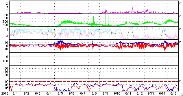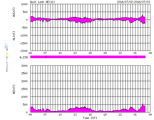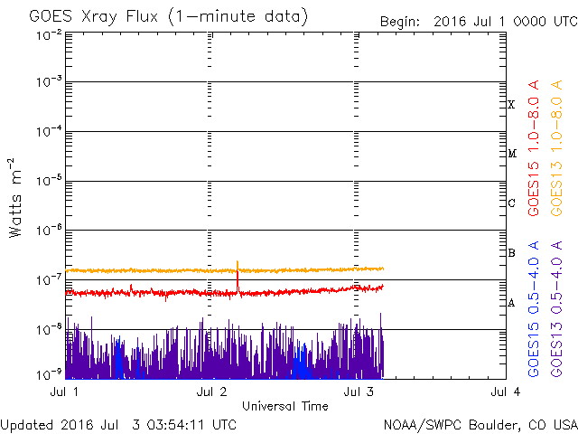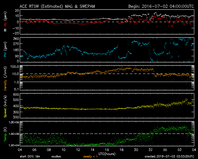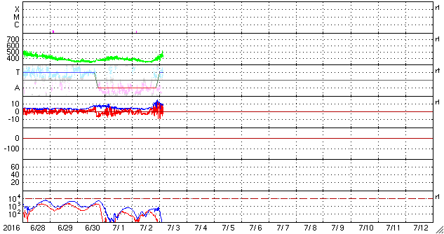 2016/ 7/ 3 12:55 更新 太陽は無黒点が続いています。太陽風は少し高まっています。 担当 篠原 太陽は、今日も黒点は見えません。 6月24日のニュースから無黒点の日が続いていて、 今日で10日連続です。 SDO衛星AIA193の写真では、 太陽の東端に、明るく光る活動的な領域が見えています。 ここに黒点があるでしょうか。 この領域の出現に注目してください。 X線のグラフは、ほとんど変化がなく、 太陽はとても静かです。 太陽風は、今日の未明に磁場強度の強まりが到来し、 5nTから10nT前後へ少し強まっています。 その後、速度も少し上がって、 370km/秒とやや低速だった太陽風は、 現在は450km/秒前後とやや高速になっています。 27日周期の図の前周期に見られた太陽風の高まりが、 少し遅れて回帰してきたようです。 前回は600km/秒まで太陽風の速度は高まりましたが、 今回はどうなるでしょうか。 そして、SDO衛星AIA193の太陽写真では、 東側に斜めに大きく広がるコロナホールが見えています。 5日後くらいから影響が及び始めそうです。 磁気圏では、小規模の変化が発生しています。 太陽風がやや強まっているので、 やや活動的な状態が続く可能性があります。 ![]() SDO衛星のAIA193カメラによる太陽コロナの様子 (c) SDO (NASA) ![]() SDO衛星による太陽の可視光写真。マウスの矢印を写真に重ねると、黒点番号付きの写真に切り替わります。 (c) SDO (NASA) ![]() GOES衛星の太陽X線データ (c) NOAA/SWPC ![]() ACEが観測した太陽風の磁場(1番上の枠、白線は全体の強度、赤線は南北成分) および、太陽風の密度(3番目の橙線)、速度(4番目の黄線) (c) NOAA/SWPC ![]() リアルタイムAE指数 下段のAEグラフの値が高くなると、オーロラ活動が活発化しています。 (c) 京都大学, NICT ![]() 27日の太陽周期に合わせたデータプロット 太陽が同じ面を地球に向けていた27日前の変化から、今後を予想することができます。 (c) 作図:宇宙天気ニュース
