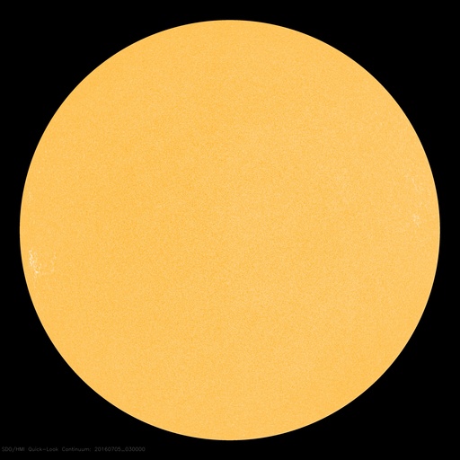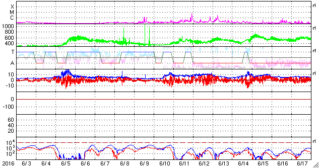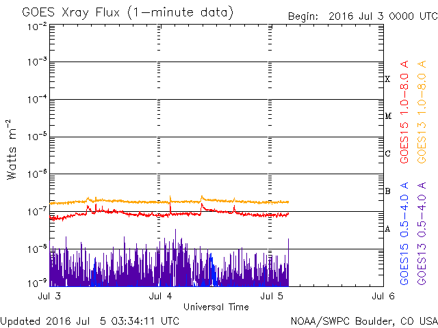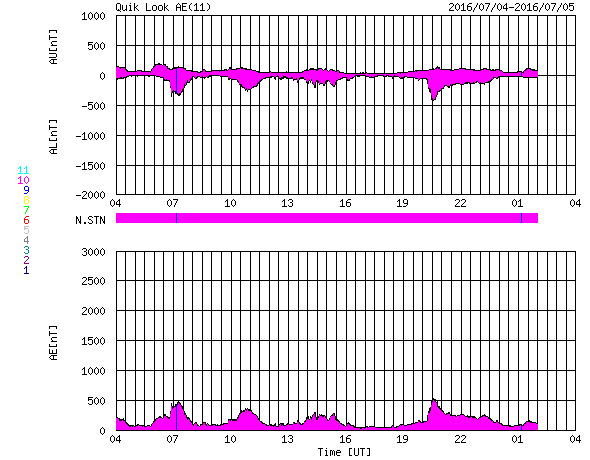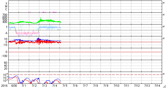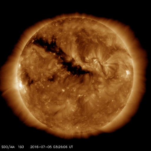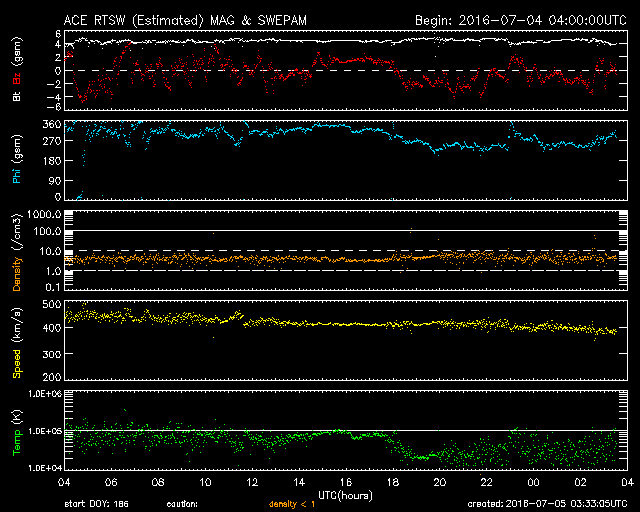 2016/ 7/ 5 12:32 更新 太陽に黒点は見えていません。太陽風は平均的な状態です。 担当 篠原 昨日、太陽の西側に現れた小さい黒点は、 それ以上目立つ大きさにはならず、 今朝くらいにほとんど見えなくなっています。 また、東端から現れた領域も、 SDO衛星の拡大写真で、 かろうじて小さい点が1つ見える程度で、 目立つほどの規模の黒点はありませんでした。 結果として、NOAA/SWPCの報告では、 今日も黒点は無しとなっています。 WDC-SILSOから発表される黒点相対数はどうなっているか、 来月の初めの発表をお待ち下さい。 東端から現れた領域は、特に活動もなく、 太陽は穏やかです。 太陽風は、速度が400km/秒へ下がり、 太陽風の弱い高まりは終わっています。 磁場強度は、5nTと平均的な値です。 SDO衛星AIA193では、コロナホールの先頭(右端)が、 太陽の中心に達しています。 3日後くらいから、太陽風は再び高まりそうです。 太陽風磁場の南北成分は、 変化は小さいですが、南寄りになっています。 このため、磁気圏では小規模の活動が続いていて、 AE指数は、300nTから500nTに達する程度の変化が、 度々発生しています。 太陽風が落ち着いてきたので、 磁気圏の変化も弱くなりそうです。