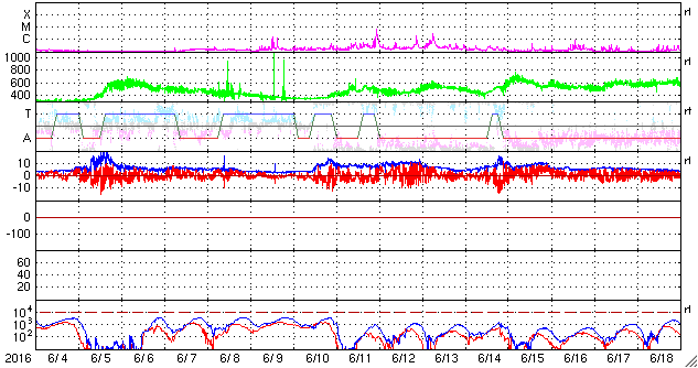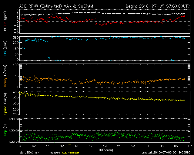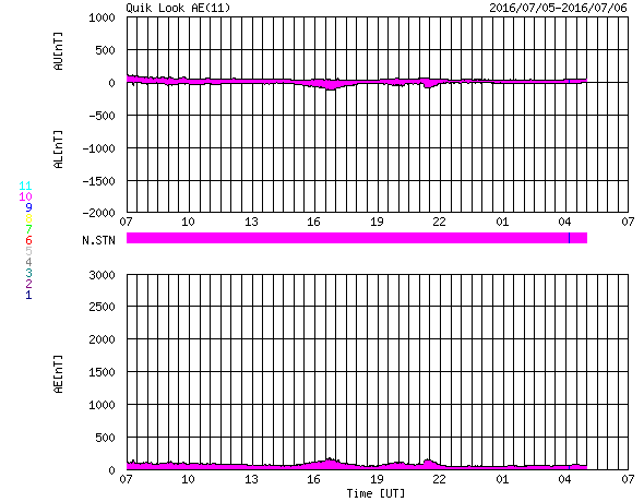 (c) SDO (NASA)、作図:宇宙天気ニュース ![]() SDO衛星のAIA193カメラによる太陽コロナの様子 (c) SDO (NASA) ![]() SDO衛星による太陽の可視光写真。マウスの矢印を写真に重ねると、黒点番号付きの写真に切り替わります。 (c) SDO (NASA) ![]() GOES衛星の太陽X線データ (c) NOAA/SWPC ![]() ACEが観測した太陽風の磁場(1番上の枠、白線は全体の強度、赤線は南北成分) および、太陽風の密度(3番目の橙線)、速度(4番目の黄線) (c) NOAA/SWPC ![]() リアルタイムAE指数 下段のAEグラフの値が高くなると、オーロラ活動が活発化しています。 (c) 京都大学, NICT ![]() 27日の太陽周期に合わせたデータプロット 太陽が同じ面を地球に向けていた27日前の変化から、今後を予想することができます。 (c) 作図:宇宙天気ニュース
