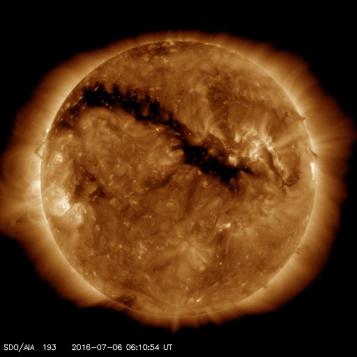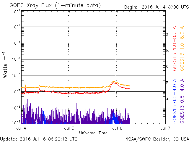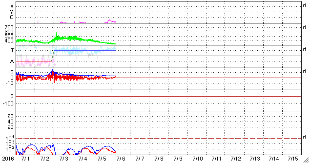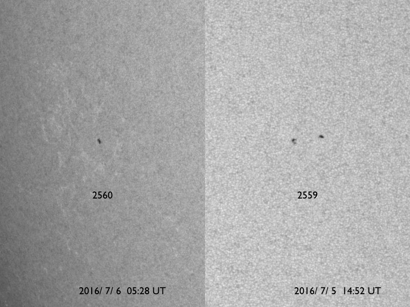2016/ 7/ 6 15:20 更新 太陽に黒点が現れています。太陽風は低速です。 担当 篠原 NOAAの黒点群リストに、6月23日以来となる、 黒点群の番号が2つ書かれています。 中央部の西寄りに現れた2559黒点群と、 東端に現れた2560群です。 2559群は、昨夕から今日の午前中にかけて見えていたようで、 一番良く見えていた深夜の写真を掲載します。 また、東端の2560群は、 掲載している太陽全体の可視光写真でも見ることができます。 こちらも拡大写真を掲載します。 黒点が現れたと言っても、 すぐに消えたり、とても小さかったりと、 またすぐに無黒点に戻ってしまいそうな様子です。 太陽風は、320km/秒に速度が下がり、 低速の風になっています。 27日周期の図を見ると、前周期と同様の推移です。 磁場強度は、4nT付近で安定しています。 南北成分は、0nT付近からやや北寄りに傾向が変わっていて、 磁気圏は穏やかになっています。 SDO衛星AIA193では、 コロナホールが太陽を東から西へ横切る勢いです。 この領域の影響が、明後日くらいから始まりそうです。