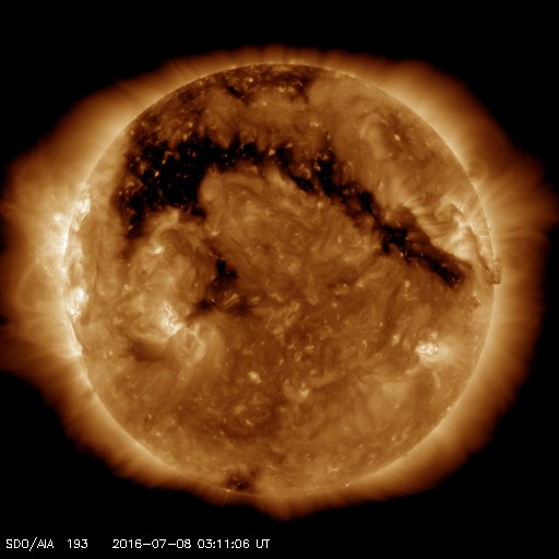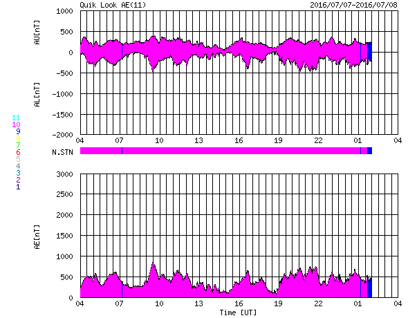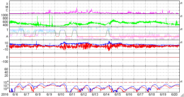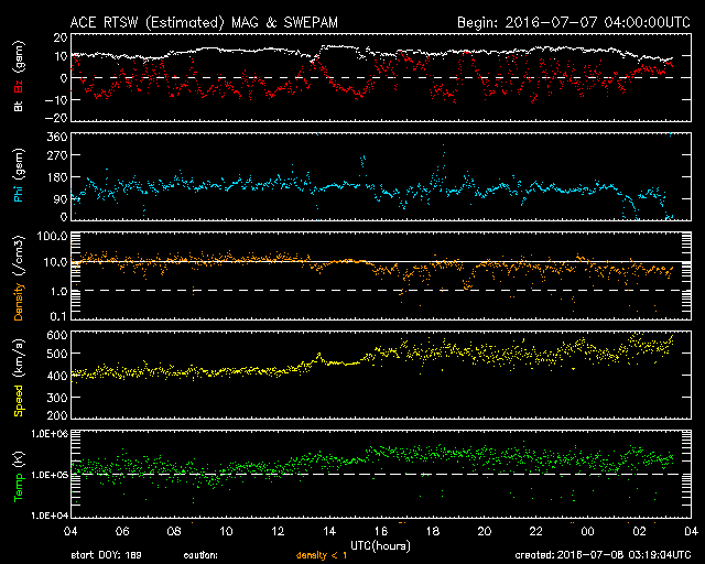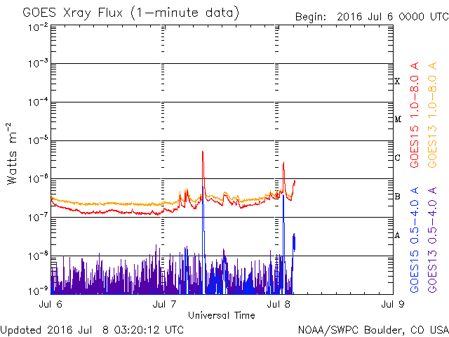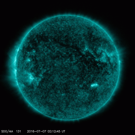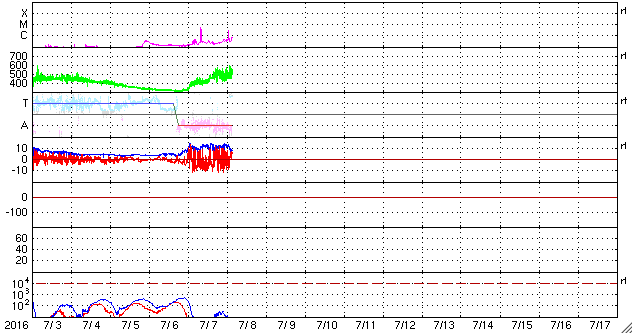 2016/ 7/ 8 12:20 更新 C5.1の小規模フレアが発生しました。太陽風は高速風になっています。 担当 篠原 太陽の南西(右下)に発生した2561黒点群で、 昨夕、7日17時(世界時7日8時)に、 C5.1の小規模フレアが発生しました。 SDO衛星AIA131による動画を掲載します。 C5に達するフレアは、およそ1か月前の、 6月11日に発生したC6.5以来です。 太陽では、東端からも南北に新しい黒点が現れています。 南側の黒点には、2562群と番号が付いています。 また、北側の黒点の近くでは、 今朝、C2.7の小規模フレアが起きています。 静かな状態が続いた太陽ですが、少し活気が出てきたようです。 太陽風は、更に速度が高まって、 520km/秒の高速風になっています。 磁場強度は、10nTから8nTへ少しだけ下がっています。 コロナホールの影響が強まってきたようです。 SDO衛星AIA193の太陽写真では、 コロナホールは太陽の北東側(左上)にかけて、大きく広がっています。 影響はしばらく続きそうです。 太陽風磁場の南北成分は、南北に頻繁に変化しています。 速度の高まりとともに、磁気圏への影響も強まっていて、 オーロラの活動度を示すAE指数のグラフは、 500〜700nTの中規模の変化が、連続的に発生しています。 27日周期の図を見ると、 前周期は太陽風の速度が600km/秒に達し、 6月19日まで高まった状態が続いています。 今回も同様の推移をすると、 7月16日頃まで太陽風の高まりは続きそうです。 ![]() 2561黒点群で発生したC5.1の小規模フレア。SDO衛星AIA131。 (c) SDO (NASA)、(動画加工 : 宇宙天気ニュース) ![]() SDO衛星のAIA193カメラによる太陽コロナの様子 (c) SDO (NASA) ![]() SDO衛星による太陽の可視光写真。マウスの矢印を写真に重ねると、黒点番号付きの写真に切り替わります。 (c) SDO (NASA) ![]() GOES衛星の太陽X線データ (c) NOAA/SWPC ![]() ACEが観測した太陽風の磁場(1番上の枠、白線は全体の強度、赤線は南北成分) および、太陽風の密度(3番目の橙線)、速度(4番目の黄線) (c) NOAA/SWPC ![]() リアルタイムAE指数 下段のAEグラフの値が高くなると、オーロラ活動が活発化しています。 (c) 京都大学, NICT ![]() 27日の太陽周期に合わせたデータプロット 太陽が同じ面を地球に向けていた27日前の変化から、今後を予想することができます。 (c) 作図:宇宙天気ニュース