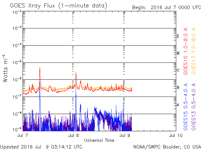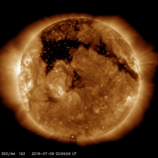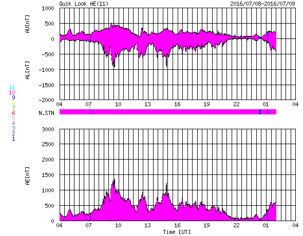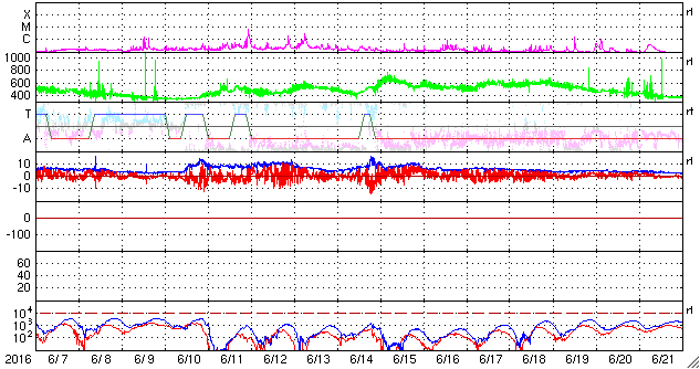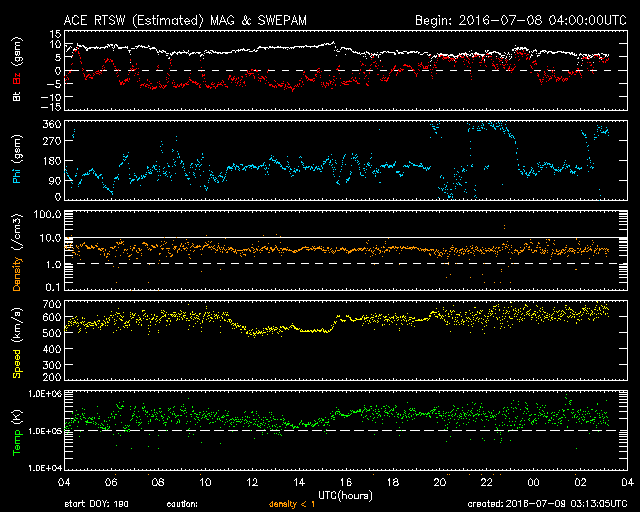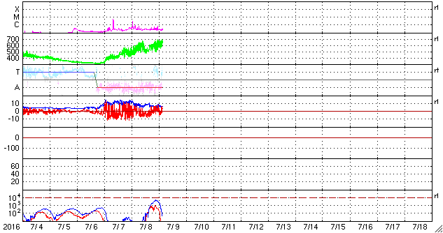 2016/ 7/ 9 12:12 更新 太陽の黒点群は4つに増えています。太陽風は600km/秒台の高速風です。 担当 篠原 太陽の可視光写真が、にぎやかになってきました。 太陽の東端の北半球側に現れていた黒点には、 2563群と番号が付き、 その向こうからもう一つ新しく、 2564群が上がってきました。 昨日のニュース以降は、 Cクラスに達するフレアは発生していませんが、 X線のグラフでは、Bクラスの小さい変化が 連続的に発生しています。 太陽風は、630km/秒へ速度が高まり、 一段と高速の風になっています。 磁場強度は、5nTヘ下がっていて、 平均的な値に戻っています。 コロナホールの影響が強まっています。 SDO衛星AIA193の太陽コロナの写真では、 太陽の北東側(左上)に、コロナホールが更に大きく広がっています。 3、4日後くらいからは、 この領域の影響が地球にやって来ると考えられ、 太陽風は、この頃にかけて強まった状態が続きそうです。 太陽風磁場の南北成分は、 南向きに変化する時間が長くなっています。 このため、磁気圏の活動も長い時間高まっていて、 AE指数は、500〜1000nTの中規模の変化が、 1日にわたって発生し、最大は1400nTに達しています。 極域ではオーロラの活動が活発に発生しているようです。