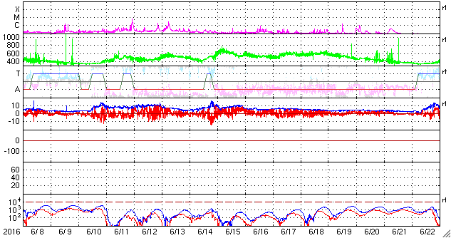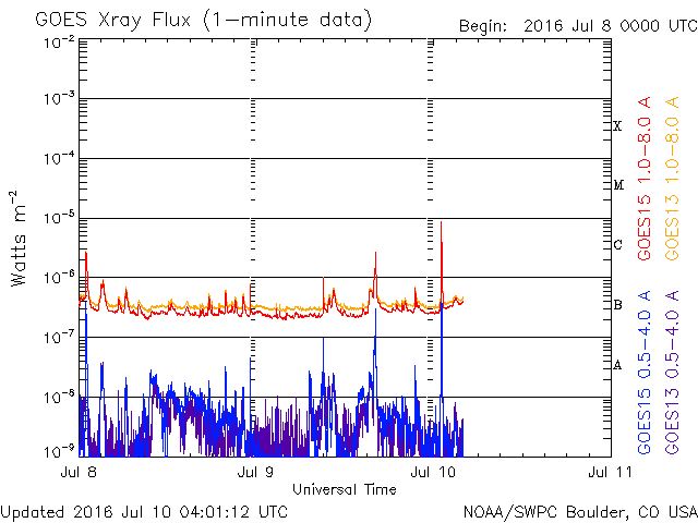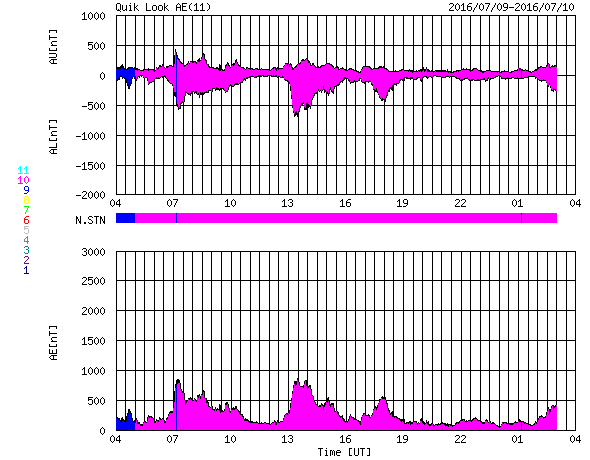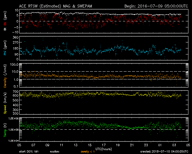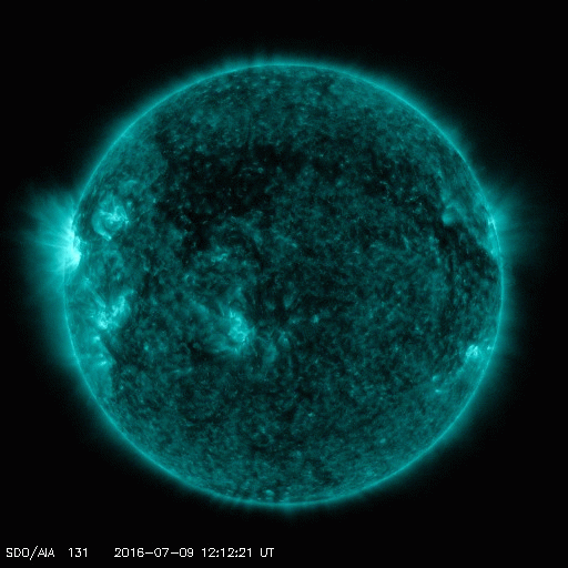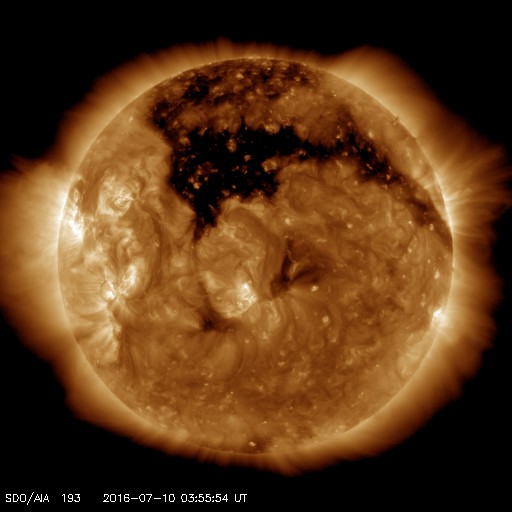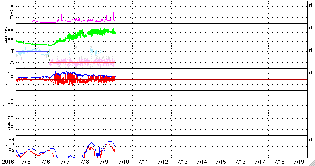 2016/ 7/10 13:01 更新 C8.6の小規模フレアが発生しました。高速の太陽風が続いています。 担当 篠原 太陽の東端から現れた2564黒点群で、 今朝、7月10日10時(世界時10日1時)に、 C8.6とやや大きい小規模フレアが発生しました。 SDO衛星AIA193による動画を掲載します。 この規模に近いフレアとしては、 5月14日のC7.4や、4月18日のM6.7以来となり、 2、3か月ぶりの発生です。 2564群は、この前にもC2.6のフレアを起こしています。 今後の活動に注目して下さい。 太陽風は、600km/秒台の高速状態が続いています。 磁場強度は5〜6nTで安定しています。 磁場の南北成分は、南北に変化していて、 速度が高まっていることもあり、磁気圏の活動は高まっています。 AE指数は500〜800nTの中規模の変化が度々発生していて、 極域ではオーロラの活動が見られているようです。 SDO衛星AIA193では、北半球のコロナホールが、 中央部で大きく広がっています。 この後も、今週の後半にかけて太陽風の強まりが続きそうです。 磁気圏も活動的な状態が続く可能性があります。