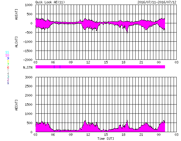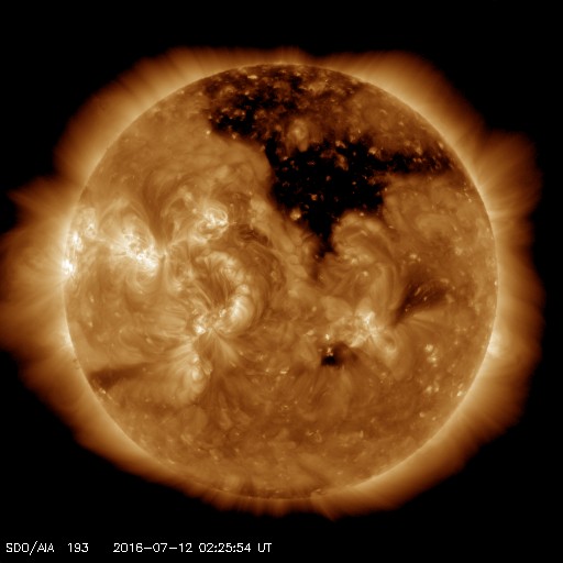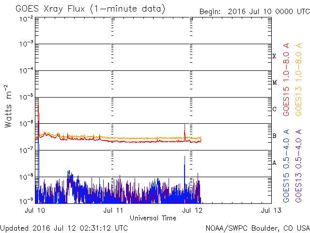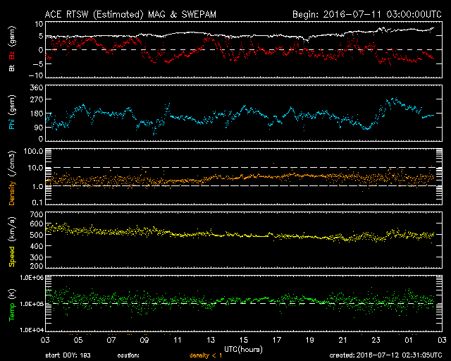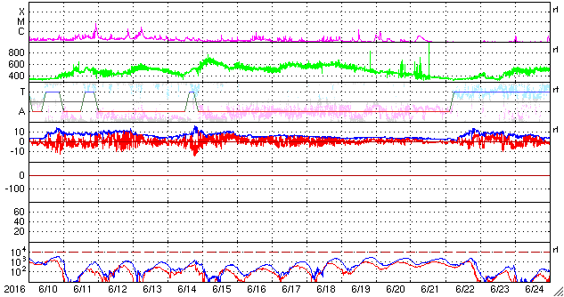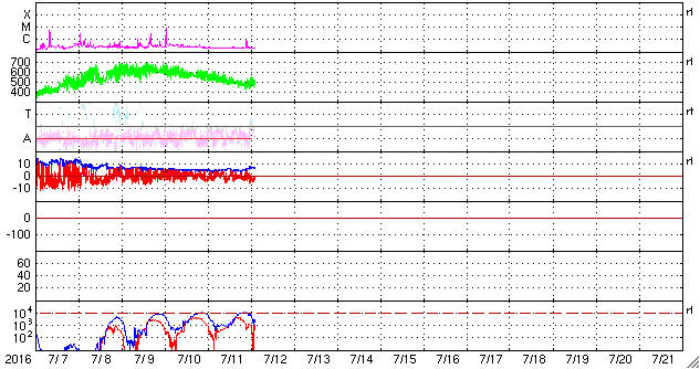 2016/ 7/12 11:31 更新 太陽風の速度は500km/秒へやや下がっていますが、高速風は続きそうです。 担当 篠原 太陽の東端の黒点に、2565群と番号が付き、 全体が見える様になっています。 目立った活動はなく、比較的穏やかな領域のようです。 太陽全体でも、 2564群でB9.4の小さいフレアが起きている程度で、 穏やかです。 太陽風は、高速の状態は続いていますが、 速度は、550km/秒から500km/秒へやや下がっています。 一方、磁場強度は、5nTから7nTへ小幅ですが上がり気味で、 コロナホールの広い部分の影響が近づいているのかもしれません。 27日周期の図でも、前周期の6月15日に、 太陽風速度の高まりが到来しています。 これから、このような変化に繋がっていくかもしれません。 磁気圏は活動的な状態が続いています。 AE指数は、500nTの中規模の変化が、繰り返し発生しています。 太陽風の高まりとともに、 磁気圏の活動も今週いっぱい続きそうです。 放射線帯の高エネルギー電子は、 GOES15の青線が10,000に達したところで、 増加は止まっています。 今後の太陽風の影響に注目してください。 ![]() SDO衛星のAIA193カメラによる太陽コロナの様子 (c) SDO (NASA) ![]() SDO衛星による太陽の可視光写真。マウスの矢印を写真に重ねると、黒点番号付きの写真に切り替わります。 (c) SDO (NASA) ![]() GOES衛星の太陽X線データ (c) NOAA/SWPC ![]() ACEが観測した太陽風の磁場(1番上の枠、白線は全体の強度、赤線は南北成分) および、太陽風の密度(3番目の橙線)、速度(4番目の黄線) (c) NOAA/SWPC ![]() リアルタイムAE指数 下段のAEグラフの値が高くなると、オーロラ活動が活発化しています。 (c) 京都大学, NICT ![]() 27日の太陽周期に合わせたデータプロット 太陽が同じ面を地球に向けていた27日前の変化から、今後を予想することができます。 (c) 作図:宇宙天気ニュース