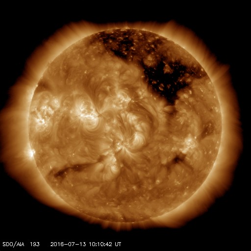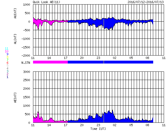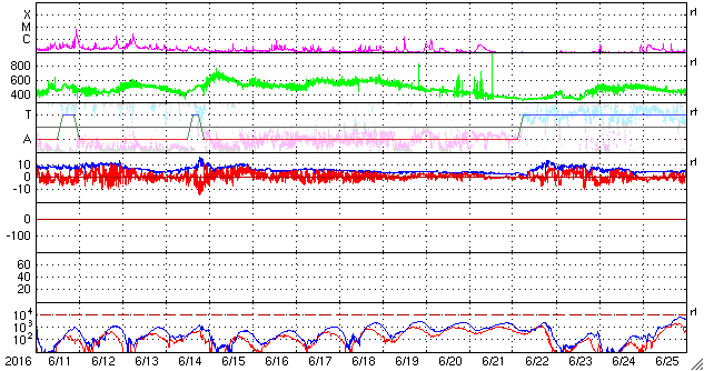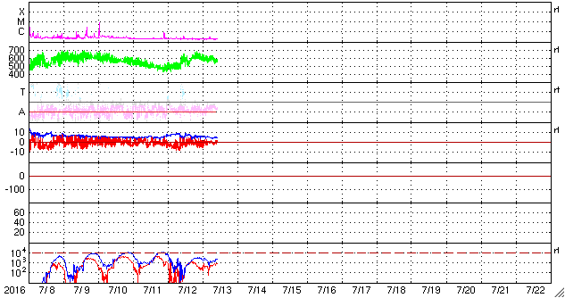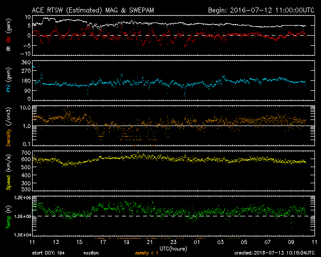 2016/ 7/13 19:16 更新 太陽風は600km/秒の高速風になっています。磁気圏の活動も強まりました。 担当 篠原 太陽風の速度は、昨夜に再び600km/秒へ高まりました。 そのまま600km/秒付近を保っていましたが、 夕方に入って、560km/秒へ少し下がっています。 太陽風の磁場強度は、速度の高まりの前に、 10nT近くまで上がりましたが、現在は5nTに戻っています。 27日周期の図の前周期の変化と同様に、 太陽風は再び高まっています。 磁気圏の活動は、磁場強度が高まっていた昨日の昼頃に、 AE指数が1000〜1500nTに達する激しい変化も起きましたが、 現在は、500nT程度にやや落ち着いています。 SDO衛星AIA193では、 コロナホールの広がりは太陽の西側だけになっています。 今回の高速太陽風は、終わりに近づいているようです。 太陽は、2565群以外の黒点が縮小していて、 目立たなくなっています。 フレアの発生も特になく、穏やかな状態が続いています。 今日は更新するタイミングがなくて、 結局夜になってしまいました。 情報提供が遅くなり、申し訳ありませんでした。 ![]() SDO衛星のAIA193カメラによる太陽コロナの様子 (c) SDO (NASA) ![]() SDO衛星による太陽の可視光写真。マウスの矢印を写真に重ねると、黒点番号付きの写真に切り替わります。 (c) SDO (NASA) ![]() ACEが観測した太陽風の磁場(1番上の枠、白線は全体の強度、赤線は南北成分) および、太陽風の密度(3番目の橙線)、速度(4番目の黄線) (c) NOAA/SWPC ![]() リアルタイムAE指数 下段のAEグラフの値が高くなると、オーロラ活動が活発化しています。 (c) 京都大学, NICT ![]() 27日の太陽周期に合わせたデータプロット 太陽が同じ面を地球に向けていた27日前の変化から、今後を予想することができます。 (c) 作図:宇宙天気ニュース