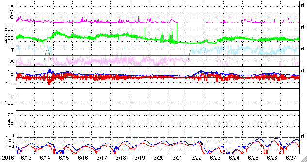 (c) SDO (NASA) ![]() SDO衛星による太陽の可視光写真。マウスの矢印を写真に重ねると、黒点番号付きの写真に切り替わります。 (c) SDO (NASA) ![]() ACEが観測した太陽風の磁場(1番上の枠、白線は全体の強度、赤線は南北成分) および、太陽風の密度(3番目の橙線)、速度(4番目の黄線) (c) NOAA/SWPC ![]() リアルタイムAE指数 下段のAEグラフの値が高くなると、オーロラ活動が活発化しています。 (c) 京都大学, NICT ![]() 27日の太陽周期に合わせたデータプロット 太陽が同じ面を地球に向けていた27日前の変化から、今後を予想することができます。 (c) 作図:宇宙天気ニュース