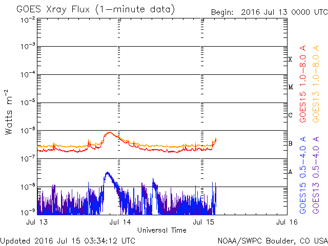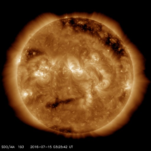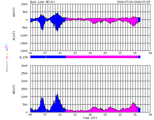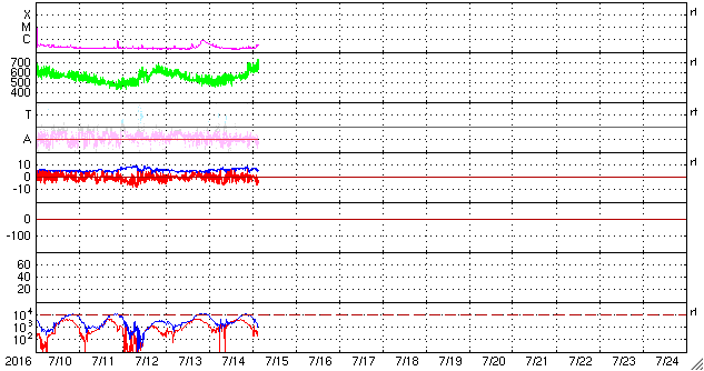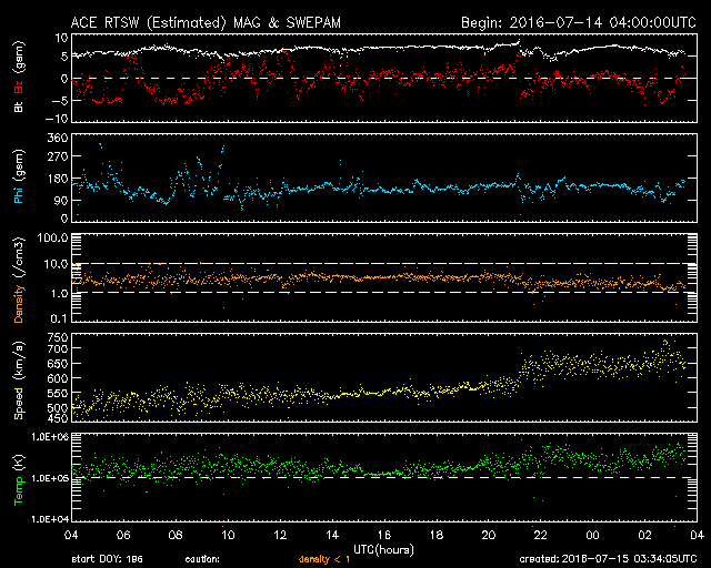 2016/ 7/15 12:34 更新 太陽風の速度は650km/秒に高まっています。 担当 篠原 今朝から、太陽風の速度が大きく上昇して、 650km/秒に達しています。 7月7日に始まった今回の太陽風の高まりの中で、 最も高い速度に達しているようです。 昨日のニュースの頃、太陽風の速度は、 480km/秒まで下がっていました。 しかし、その後、ゆっくりと上昇して、 今朝、15日6時(世界時14日21時)頃に、 600km/秒へ上がる変化が見られました。 その後も、速度はやや高まる傾向にあり、 現在は、650km/秒を少し超えているかもしれません。 コロナホールの最後の広がりの影響がやって来たようです。 ただ、コロナホール自体は、全体が西の端に近づいていて、 影響はあまり長く続かないと思われます。 太陽風の磁場強度は、5〜7nT付近にあって、 安定しています。 南北成分は、南に振れたり、0nT付近で小さくなったりと、 時間帯によって傾向が変わっていて、 南を向いた頃に、AE指数が1000nTに達する変化を記録しています。 現在は、速度が一段高まっているので、 磁場が南向きに振れれば、磁気圏の活動も強まりやすい状況です。 太陽は、2565群の周囲に黒点が新しく出現しています。 群としても別になるかもしれません。 また、南東(左下)にも黒点が発生しています。 明日には番号が付けられているでしょう。 フレアの発生は特にありません。 放射線帯の高エネルギー電子は、 昨日よりも下がり気味ですが、10,000に達しています。 太陽風が再び高まったので、 高エネルギー電子も再度増加するかもしれません。