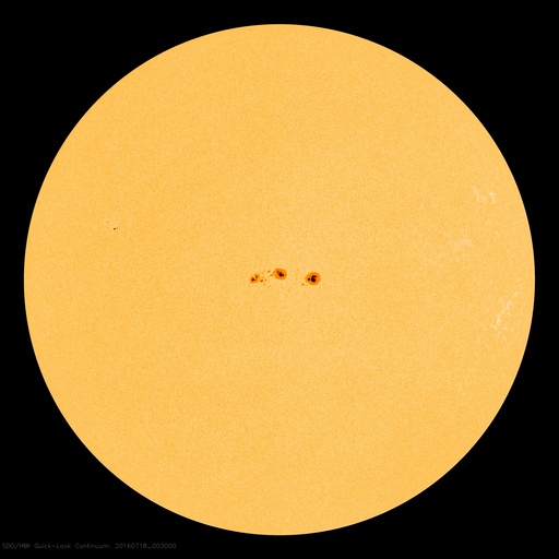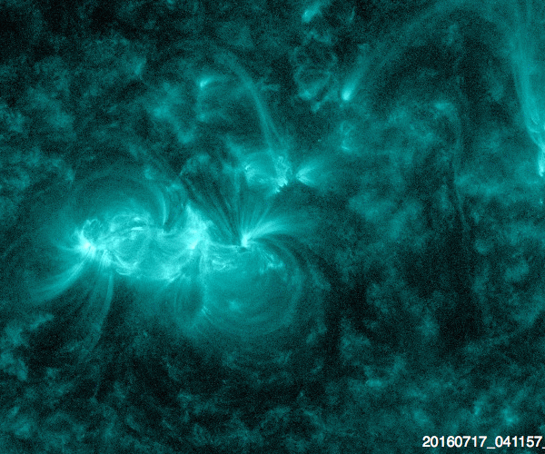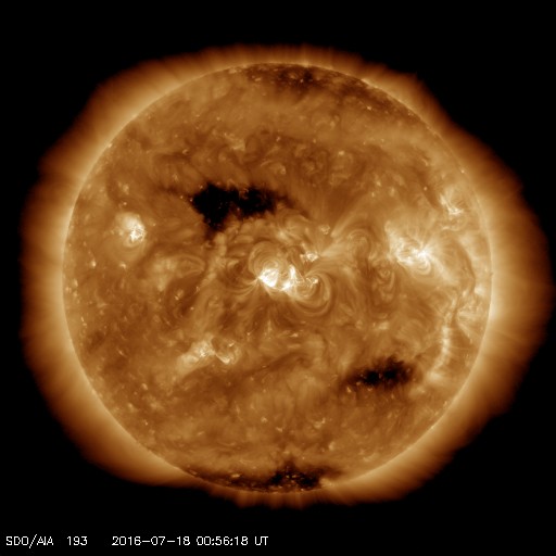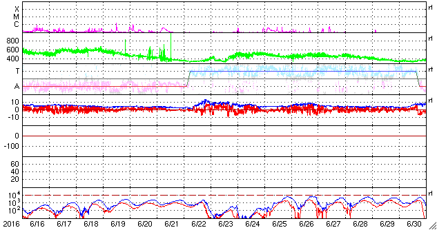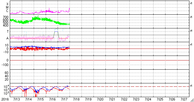 2016/ 7/18 10:06 更新 2565群でC6.6の小規模フレアが発生しています。太陽風は平均的な状態に戻っています。 担当 篠原 太陽の中央の2567黒点群、2565黒点群で、 フレアの発生が続いています。 NOAAのリストでは、 昨日の朝のC1.3まで、2567群で発生し、 その後は、2565群の発生となっていますが、 C1.4、C1.0と続いて、今朝、18日8時(世界時17日23時)に、 C6.6と、16日に続いてやや大きい小規模フレアが発生しました。 SDO衛星AIA131の動画を掲載します。 活動している領域の右側が2565群、左側が2567群です。 この領域の活動に、引き続き注目して下さい。 太陽風は、昨日のニュース以降も速度はゆっくりと下がり、 現在は430km/秒と平均的な状態に戻っています。 27日周期の図の前周期の高速風と、 同じような終わり方になりました。 磁場強度は、3nTから5nTへ少し上がって、 平均的な強さに戻っています。 磁場の南北成分は、 グラフの前半は南寄りとなっていますが、 振れ幅は小さく、速度も下がってきたので、 磁気圏への影響は弱くなっているようで、 AE指数は、250nT程度の小規模の変化が、 だらだらと続くようなグラフになっています。 SDO衛星AIA193の太陽コロナ写真では、 太陽の南西(右下)と、中央部の北側にコロナホールが見えています。 前周期は、6月24日頃から、 速度が500km/秒に上がる変化が到来していましたが、 今回はどうなるでしょうか。 放射線帯の高エネルギー電子は、 昨日、今日とゆっくりと増加して、 GOES15(青線)が、10,000のレベルに達しています。 ![]() 2567(左)、2565(右)黒点群の活動の様子。SDO衛星AIA131。 (c) SDO(NASA)、(動画加工 : 宇宙天気ニュース) ![]() SDO衛星のAIA193カメラによる太陽コロナの様子 (c) SDO (NASA) ![]() SDO衛星による太陽の可視光写真。マウスの矢印を写真に重ねると、黒点番号付きの写真に切り替わります。 (c) SDO (NASA) ![]() GOES衛星の太陽X線データ (c) NOAA/SWPC ![]() ACEが観測した太陽風の磁場(1番上の枠、白線は全体の強度、赤線は南北成分) および、太陽風の密度(3番目の橙線)、速度(4番目の黄線) (c) NOAA/SWPC ![]() リアルタイムAE指数 下段のAEグラフの値が高くなると、オーロラ活動が活発化しています。 (c) 京都大学, NICT ![]() 27日の太陽周期に合わせたデータプロット 太陽が同じ面を地球に向けていた27日前の変化から、今後を予想することができます。 (c) 作図:宇宙天気ニュース