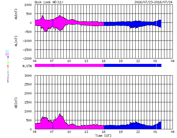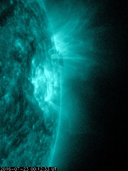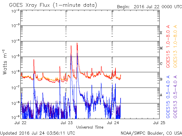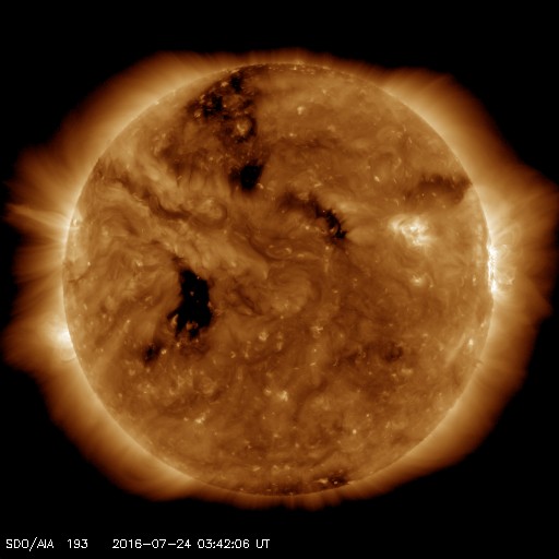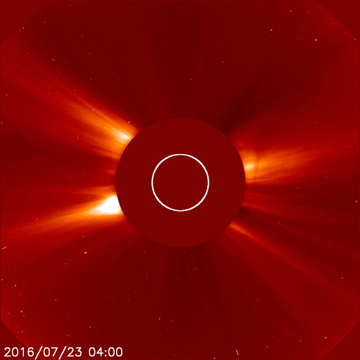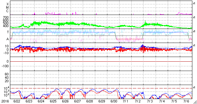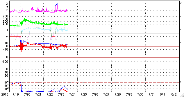 2016/ 7/24 12:56 更新 M7.6、M5.5と中規模フレアが2回発生しています。 担当 篠原 2567黒点群で、M7.6、M5.5と、 更に2つの中規模フレアが発生しました。 昨日の午後、23日14時(世界時23日5時)と、 23日14時半(世界時23日5時半)です。 SDO衛星AIA131とAIA304による動画を掲載します。 最初のフレア(世界時23日2時)は、昨日お知らせしたM5.0で、 その直後に、M7.6、M5.5のフレアが、 写真の上下に並んで発生しています。 2567群では、Mフレア以降も、 C1〜2の小規模フレアが、これまでに6回起きていて、 動画の中でも、小さい活動が繰り返し発生しています。 今回のフレアに伴って、 CME(太陽ガスの放出現象)も発生しています。 SOHO衛星LASCO C2、C3の動画を掲載します。 発生箇所が西の端だったので、 太陽のガスは右方向に飛び出しています。 このため、地球への影響はないでしょう。 2567黒点群は、もうすぐ見えなくなります。 完全に没するまで注目して下さい。 一方、その他の部分に黒点はなく、 明日の太陽写真は、無黒点になっているかもしれません。 太陽風は、370km/秒とやや低速の状態で安定しています。 磁場強度は、7nTとやや高まった状態が続いています。 磁場の南北成分は、グラフの前半は南寄りですが、 中盤以降は北寄りになっています。 磁気圏も基本的に穏やかで、 AE指数のグラフは、前半に高まりがありますが、 以降は静かです。 太陽風は、しばらく穏やかに推移しそうです。