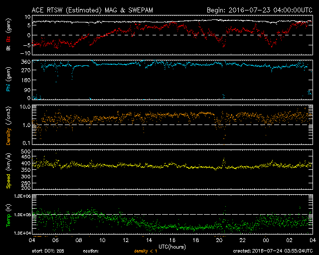 (c) SDO (NASA)、(動画加工 : 宇宙天気ニュース) ![]() Mフレアに伴って発生したCMEの様子。SOHO衛星LASCO C2、C3。 (c) SOHO (ESA & NASA)、 (動画加工 : 宇宙天気ニュース) ![]() SDO衛星のAIA193カメラによる太陽コロナの様子 (c) SDO (NASA) ![]() SDO衛星による太陽の可視光写真。マウスの矢印を写真に重ねると、黒点番号付きの写真に切り替わります。 (c) SDO (NASA) ![]() GOES衛星の太陽X線データ (c) NOAA/SWPC ![]() ACEが観測した太陽風の磁場(1番上の枠、白線は全体の強度、赤線は南北成分) および、太陽風の密度(3番目の橙線)、速度(4番目の黄線) (c) NOAA/SWPC ![]() リアルタイムAE指数 下段のAEグラフの値が高くなると、オーロラ活動が活発化しています。 (c) 京都大学, NICT ![]() 27日の太陽周期に合わせたデータプロット 太陽が同じ面を地球に向けていた27日前の変化から、今後を予想することができます。 (c) 作図:宇宙天気ニュース