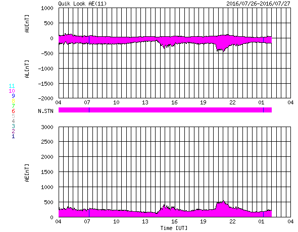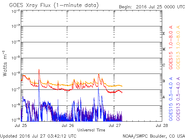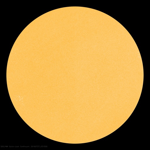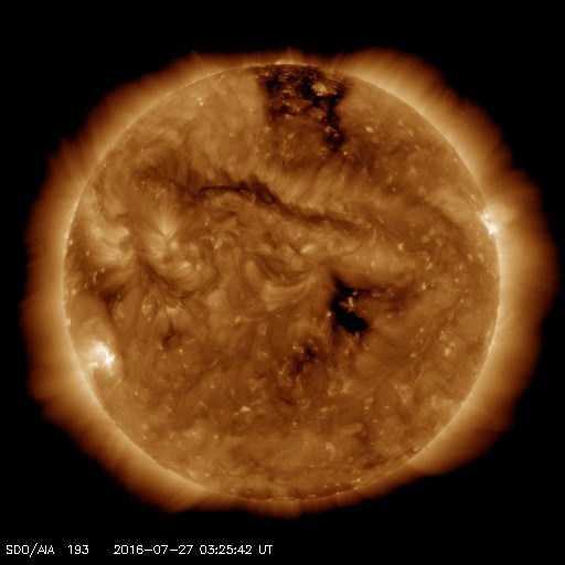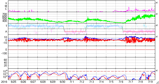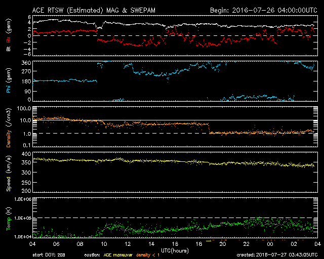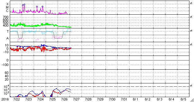 2016/ 7/27 12:42 更新 太陽は無黒点が続いています。太陽風は低速で穏やかです。 担当 篠原 太陽は、今日も無黒点です。 25日から見えなくなっているので、3日連続です。 可視光写真を見ると、南東(左下)に白斑が見える領域があり、 SDO衛星AIA193でも、ここは明るく光っているのですが、 黒点は見えていません。 STEREO Ahead衛星の写真でも、 太陽の東端の向こう側には黒点はないようで、 無黒点の状態はしばらく続くかもしれません。 X線グラフは、Bクラスの小さい変化が続いていますが、 西の端の向こう側で起きている現象で、 今後は見えなくなります。 太陽風の速度は、350km/秒から330km/秒へ、 更に低速になっています。 磁場強度も、3nTに下がっていて、 太陽風は穏やかになっています。 磁場の南北成分は、南寄りの傾向となっていますが、 振れ幅は小さく、速度も遅くなっているため、 磁気圏への影響は弱く、 AE指数は、2回ほど小規模の変化が起きている程度です。 SDO衛星AIA193では、太陽の中心部の西寄り(右側)に、 小さいコロナホールが見えています。 明後日くらいから、 太陽風に弱い影響がやって来るかもしれません。 ![]() SDO衛星のAIA193カメラによる太陽コロナの様子 (c) SDO (NASA) ![]() SDO衛星による太陽の可視光写真。マウスの矢印を写真に重ねると、黒点番号付きの写真に切り替わります。 (c) SDO (NASA) ![]() GOES衛星の太陽X線データ (c) NOAA/SWPC ![]() ACEが観測した太陽風の磁場(1番上の枠、白線は全体の強度、赤線は南北成分) および、太陽風の密度(3番目の橙線)、速度(4番目の黄線) (c) NOAA/SWPC ![]() リアルタイムAE指数 下段のAEグラフの値が高くなると、オーロラ活動が活発化しています。 (c) 京都大学, NICT ![]() 27日の太陽周期に合わせたデータプロット 太陽が同じ面を地球に向けていた27日前の変化から、今後を予想することができます。 (c) 作図:宇宙天気ニュース