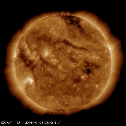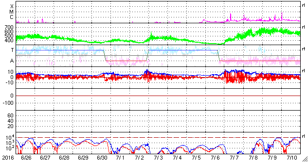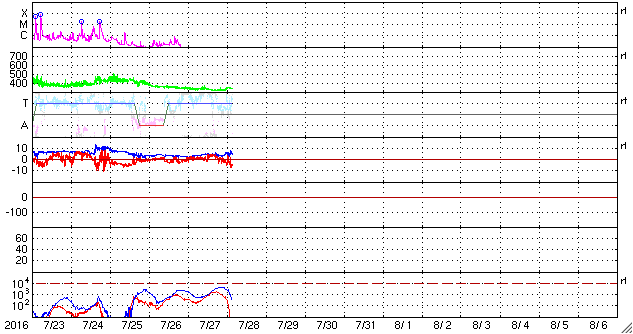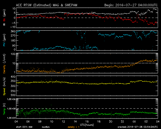 2016/ 7/28 12:55 更新 低速の太陽風が続いています。太陽は無黒点です。カナダのオーロラをどうぞ。 担当 篠原 カナダの高坂雄一さんより、 カナダ・アルバータ州の米国国境にある、 ウォータートンレイクス国立公園で撮影された オーロラの写真をいただきました。 撮影は、現地25日0時過ぎ(世界時25日6時)とのことで、 一昨日(26日)のニュースで紹介した、 ニュージーランドのオーロラの約3時間前です。 撮影場所はずいぶん離れていますが、 ほぼ同じオーロラの活動を、南北で捉えたと言えるでしょう。 一昨日の写真に見えていたオーロラの光の柱と同様の柱が、 今日の2枚目の写真に見えています。 撮影地はどちらも緯度が低めで、 この時間帯、オーロラの領域が低緯度側に広がっていたようです。 低空をオーロラが赤く染めて、とても美しい光景です。 一枚目は、左側に北斗七星が輝き 二枚目は、上端の白鳥座から低空のカシオペヤ座へ天の川が 美しく流れています。 自然公園の中ですから、山並みもさぞ絶景なのだとうと思います。 素敵な夏のオーロラを、どうもありがとうございます。 現在の太陽風は、速度が330km/秒へ下がったままで、 低速風が続いています。 磁場強度は、4〜5nTと穏やかに推移していましたが、 今朝くらいからやや強まり始め、現在は10nT近くに高まっています。 27日周期の図を見ると、 前周期も、6月30日〜7月1日と7月2日〜3日に、 磁場の強まりが到来しています。 これらの変化が回帰しているのかもしれません。 この後、速度の変化も伴うかどうか、 しばらく注目して下さい。 磁場が強まるとともに、南北成分は南向きに振れて、 現在、-5nTを超えるくらいに達しています。 速度が遅いので、大きな変化にはなりませんが、 磁気圏の活動がある程度高まりそうです。 太陽は、今日も無黒点です。 X線のグラフは変化がなくなり、とても静かです。 ![]() カナダのウォータートンレイクス国立公園で、現地25日0時(世界時25日6時)に撮影されたオーロラ。 (c) 高坂雄一氏 ![]() カナダのウォータートンレイクス国立公園で、現地25日0時(世界時25日6時)に撮影されたオーロラ。 (c) 高坂雄一氏 ![]() SDO衛星のAIA193カメラによる太陽コロナの様子 (c) SDO (NASA) ![]() SDO衛星による太陽の可視光写真。マウスの矢印を写真に重ねると、黒点番号付きの写真に切り替わります。 (c) SDO (NASA) ![]() ACEが観測した太陽風の磁場(1番上の枠、白線は全体の強度、赤線は南北成分) および、太陽風の密度(3番目の橙線)、速度(4番目の黄線) (c) NOAA/SWPC ![]() リアルタイムAE指数 下段のAEグラフの値が高くなると、オーロラ活動が活発化しています。 (c) 京都大学, NICT ![]() 27日の太陽周期に合わせたデータプロット 太陽が同じ面を地球に向けていた27日前の変化から、今後を予想することができます。 (c) 作図:宇宙天気ニュース