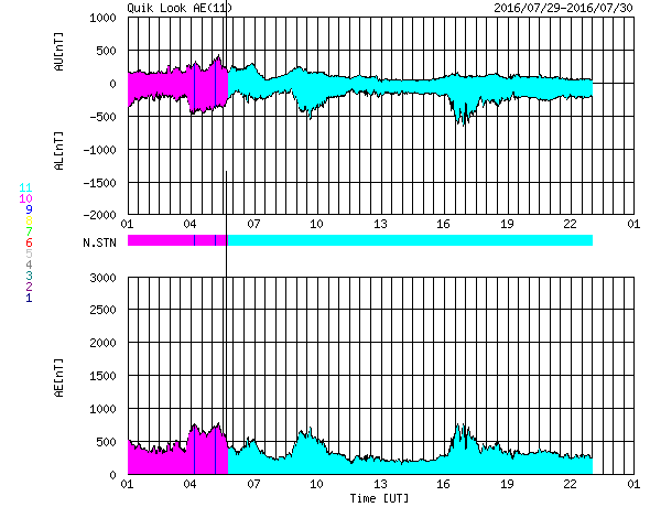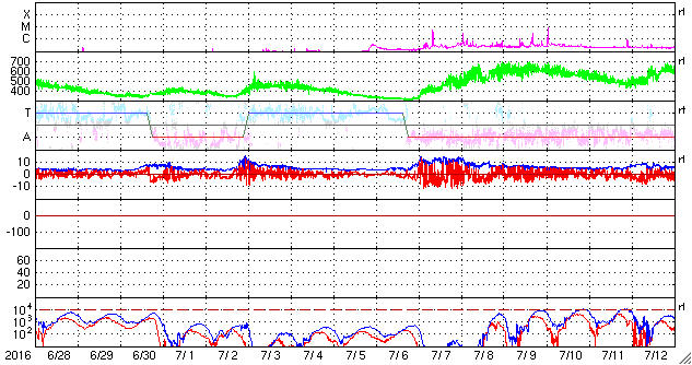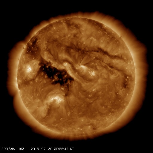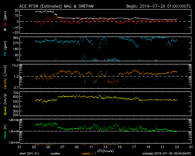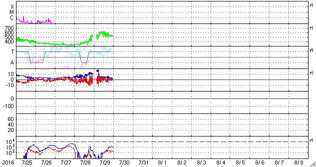2016/ 7/30 09:40 更新 太陽風の速度は600km/秒に高まりました。現在は下がり始めています。 担当 篠原 太陽風の速度は、昨日のニュースの直後、 29日15時(世界時29日6時)にもう一段高まって、 600km/秒に達しました。 反対に、15nTを超えて強まっていた磁場強度は、 5nTと平均的な値へ一気に下がっています。 以降、深夜まで600km/秒近いかなり高い速度が続きましたが、 今朝にかけてゆっくりと下がり、現在は530km/秒と、 高速の状態は続いていますが、やや落ち着いた感じです。 磁場強度も、3nT程度へ弱まっています。 太陽風磁場の南北成分は、0nT付近を小さく変化する程度で、 速度は上がりましたが、磁気圏への影響は特に高まっていません。 AE指数は、500〜700nTの中規模の変化が数回発生した程度です。 磁場強度が下がったので、 太陽風の高まりは後半に入っていると思われます。 速度はゆっくりと下がっていきそうです。 一方、SDO衛星AIA193では、 中央部のコロナホールが、太陽の中心線に達しています。 3日後くらいから次の高速太陽風がやって来そうです。 27日周期の図を見ると、前周期の7月7日から太陽風が高まっています。 今回、コロナホールの位置が少し西に進んでいるようで、 太陽風の変化の到来は、27日周期の図よりも早まるかもしれません。 太陽は、2570黒点群が見えています。 特に活動はなく、太陽はとても穏やかです。