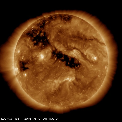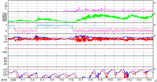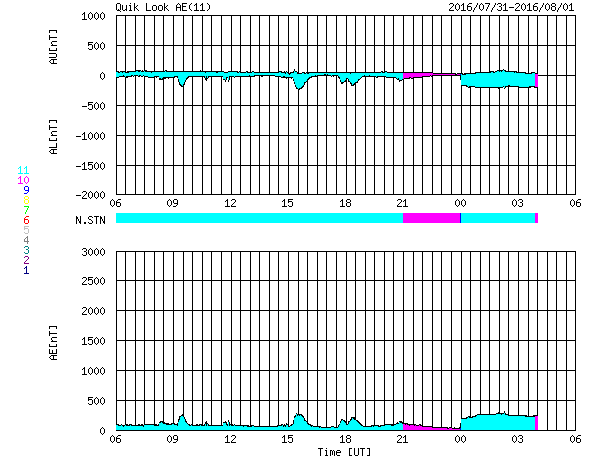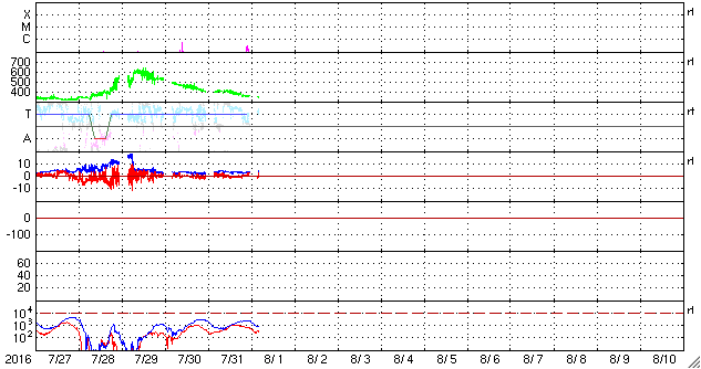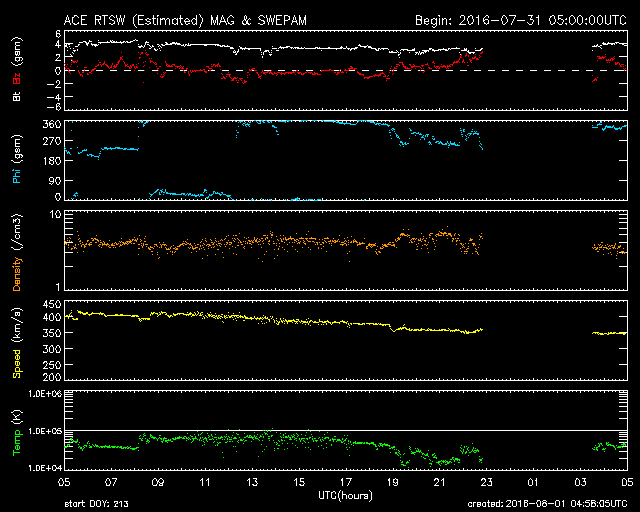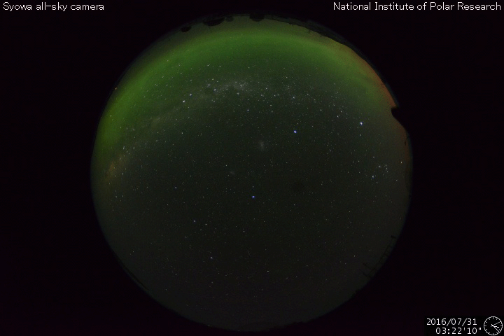 2016/ 8/ 1 13:59 更新 太陽風は低速で、磁気圏も穏やかです。 担当 篠原 太陽風の速度は、400km/秒から350km/秒へ下がり、 低速の風になっています。 磁場強度は、3〜4nTとやや弱まった状態です。 磁気圏は概ね静穏で、 AE指数のグラフは、時々小さい変化が見られる程度です。 オーロラの活動は穏やかでしたが、 南極の昭和基地で、 朝の薄明で赤く染まる空の様子が撮影されていました。 写真では、最後まで天の川も見えているので、 実際にはまだ淡い光なのだと思います。 とてもきれいな夜明けです。 SDO衛星AIA193では、 コロナホールが太陽の中心を横切っています。 この領域による影響が近づいています。 太陽は、2570黒点群は見えなくなりました。 SDO衛星の可視光写真では、 太陽の西寄り(右側)に小さい黒点が出現しましたが、 現在はほとんど見えなくなっています。 ![]() 南極の昭和基地の朝の薄明。 (c) 国立極地研究所、(動画加工 : 宇宙天気ニュース) ![]() SDO衛星のAIA193カメラによる太陽コロナの様子 (c) SDO (NASA) ![]() SDO衛星による太陽の可視光写真。マウスの矢印を写真に重ねると、黒点番号付きの写真に切り替わります。 (c) SDO (NASA) ![]() ACEが観測した太陽風の磁場(1番上の枠、白線は全体の強度、赤線は南北成分) および、太陽風の密度(3番目の橙線)、速度(4番目の黄線) (c) NOAA/SWPC ![]() リアルタイムAE指数 下段のAEグラフの値が高くなると、オーロラ活動が活発化しています。 (c) 京都大学, NICT ![]() 27日の太陽周期に合わせたデータプロット 太陽が同じ面を地球に向けていた27日前の変化から、今後を予想することができます。 (c) 作図:宇宙天気ニュース
