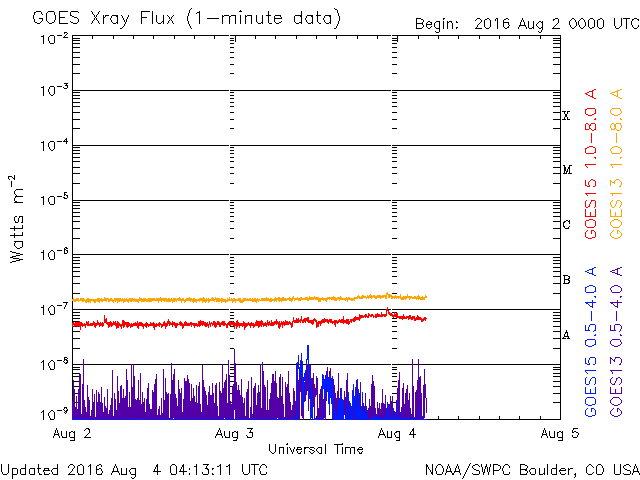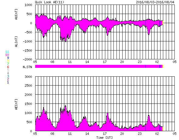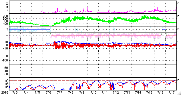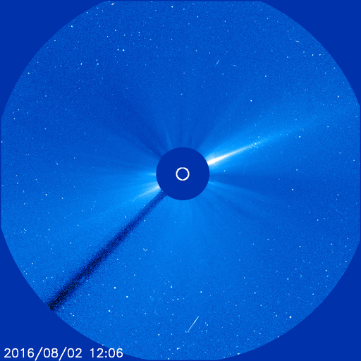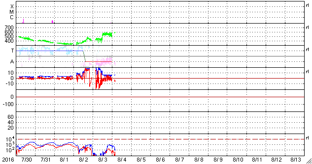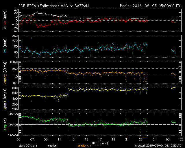 2016/ 8/ 4 13:12 更新 太陽風は600km/秒の高速風になっています。磁気圏の活動も活発です。 担当 篠原 宇宙天気の話題ではありませんが、 SOHO衛星LASCO C3の右下から、 小型の彗星が太陽に近づいています。 次第に尾を伸ばしていく様子を動画でご覧下さい。 この後、水星はLASCO C2の写野に入ります。 太陽通過前後の変化が楽しみです。 太陽風は、昨夜、3日21時(世界時3日12時)に、 もう一段速度が上昇して、550km/秒の高速風になりました。 一方、磁場強度は下がって、5nT付近と平均的な値に戻っています。 磁場の南北成分は、南寄りの傾向が続き、 磁気圏は活動の高まりが続いています。 AE指数は、1000nT付近の大きな変化が繰り返し発生していて、 最大の変化は1400nTに達しています。 極域では、活発なオーロラの活動が見られたのではないでしょうか。 ACE衛星のデータは、後半から途切れていましたが、 最新のデータが少しだけ更新されて、 現在の速度は、600km/秒に上がっているようです。 27日周期の図を参照すると、 前周期は、更に10日程度高速の太陽風が続きました。 今回も同じような変化をすると、 太陽風は13日頃まで高まった状態が続くかもしれません。 今日は、SDO衛星のデータ更新が止まっています。 NOAA/SWPCの情報では、黒点群は無しになっています。 (13:35追加) 可視光写真が更新されたので、追加します。