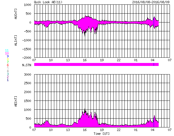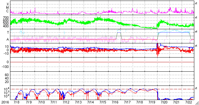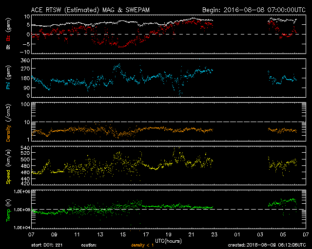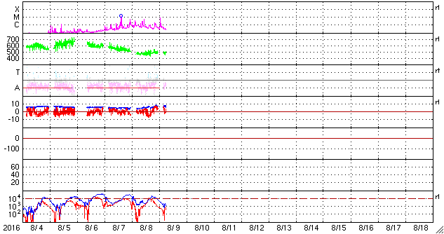 2016/ 8/ 9 15:13 更新 太陽の東端に黒点群が4つ現れています。高速の太陽風は続いています。 担当 篠原 太陽は、東の端から2573群、23574群の全体が見える様になり、 南半球には、2576群も姿を現しています。 2574群でC3.1、C5.6の小規模フレアが昨日発生し、 今朝は、2573群でC8.9のフレアが起きています。 これらの黒点群は、これから太陽の中心へ進むので、 活動が強まれば、地球へ影響が及ぶ可能性も高まります。 引き続き注目してください。 太陽風は、460km/秒から490km/秒へ速度が少し上がり、 高速の風は続いています。 また、磁場強度も、5nTから7nTへ少し強くなっています。 速度の変化はもう少し続くかもしれません。 太陽風磁場の南北成分は、 やや北寄りの傾向になっているようです。 このため、南向きに振れた時間帯に、 AE指数の変化が発生して目立っています。 規模も1000nTと比較的大きくなっています。 27日周期の図を見ると、 前周期はもう4日ほど高速風が続きました。 今回はどこまで続くでしょうか。 放射線帯の高エネルギー電子は、今日も高まった状態が続き、 GOES15(青線)、GOES13(赤線)ともに、10,000に達しています。 ただし、全体としては減少の傾向にあるように見えます。 明日は、10,000を割っているかもしれません。