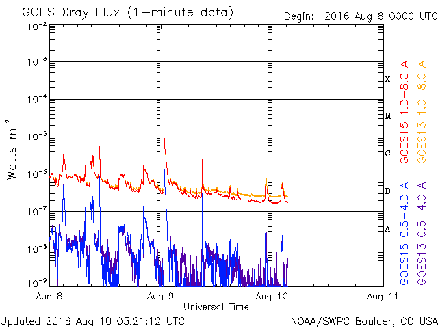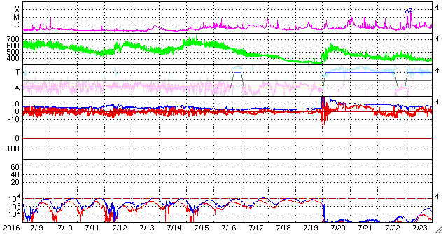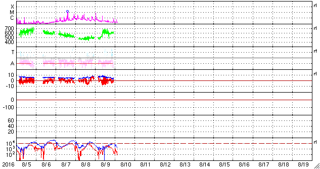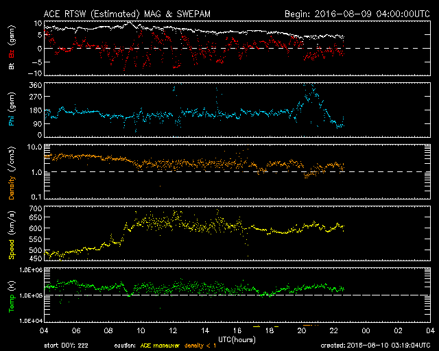 2016/ 8/10 12:21 更新 太陽風の速度は、600km/秒に上がっています。 担当 篠原 太陽風の速度は、昨日の夕方にもう一段上昇して、 9日18時(世界時9日9時)に、600km/秒に達しています。 その後も安定して、現在まで600km/秒の高い速度を保っています。 太陽風の磁場強度は、7nTから5nTへ少し下がっています。 速度の上昇は落ち着いたようです。 27日周期の図の前周期に見られた、太陽風速度の高まりが、 今回も回帰してきたようです。 一方、8月3日から続いてきた高速風の領域も、 残り3〜4日程度かもしれません。 太陽は、昨日のC8.9以降は、 C2.5の小規模フレアと、Bクラスの変化が起きている程度で、 比較的落ち着いています。 東端の黒点群たちは、太陽の中心に向かって進んでいますが、 NOAAの黒点群リストの中身に変化があり、 2573群がなくなって、その付近に2574群が置かれています。 放射線帯の高エネルギー電子は、減少の傾向が続き、 GOES15(青線)も、10,000に達したかどうかという程度です。 今回の太陽風速度の高まりで、 この後どのように変化するでしょうか。
